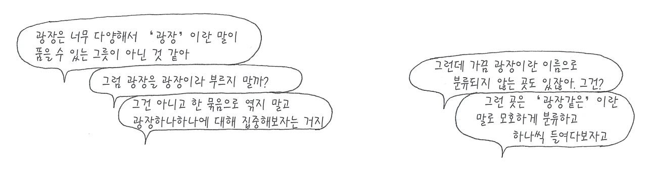 그 다양함을 정확히 표현하기에 한계가 있을 만큼 모든 광장은 다르다. 게다가 '광장'이라는 이름으로 분류되지 않은 모호한 장소들은 광장의 수보다 더 많을지도 모르겠다. 그러니 더 이상 무엇인 것과 아닌 것의 차이가 중요하지 않게 되고, 장소와 관련된 단어들은 모호함의 미궁 속에 빠지게 된다.