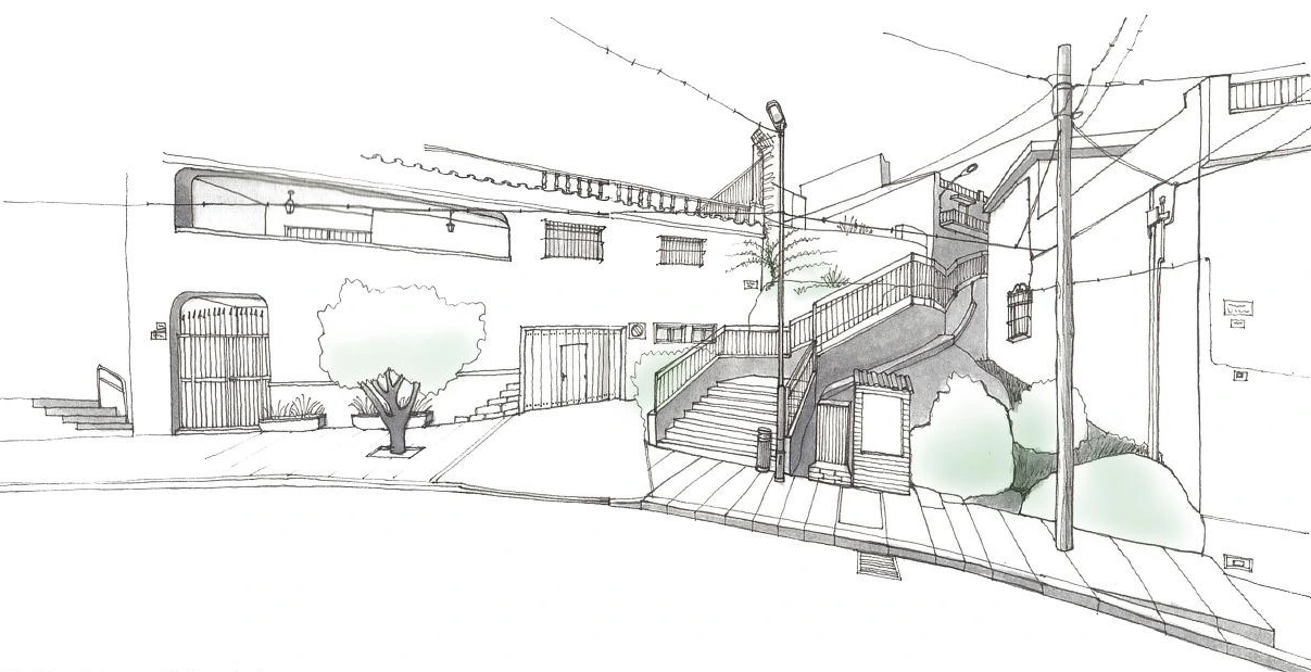 서로 다른 것들이 만날 때, 틈은 더욱 벌어지게 마련이다. 틈 사이에 S자를 그리며 계단이 지나가고, 계단과 건물 사이 벌어진 틈에 땅의 속살이 드러난다.