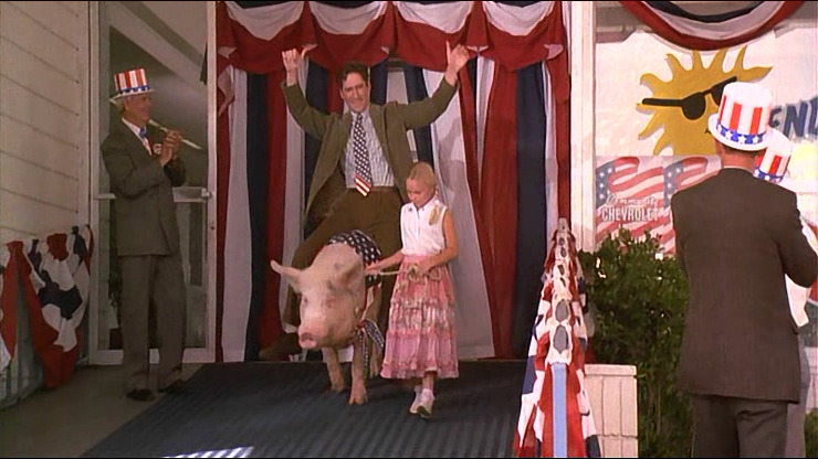 돼지의 등에서 내린 데이브는 “자동차는 세보레죠.” 하며 대통령의 말과 행동을 흉내 냅니다. 데이브는 대통령을 연기하며 주변인들을 즐겁게 해줍니다.