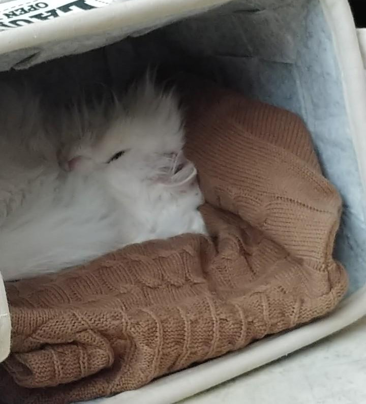 두리번거리다 찾아낸 잡동사니 넣어두던 바구니가 생각나서 바로 집을 만들어 주었죠. 안 입는 스웨터가 마침 있어서 바닥을 깔아주니 바로 들어가는 겁니다. 무릎담요를 어디다 둔 것 같은데 찾아내서 우리 씨 집을 꾸며 줘야겠어요.