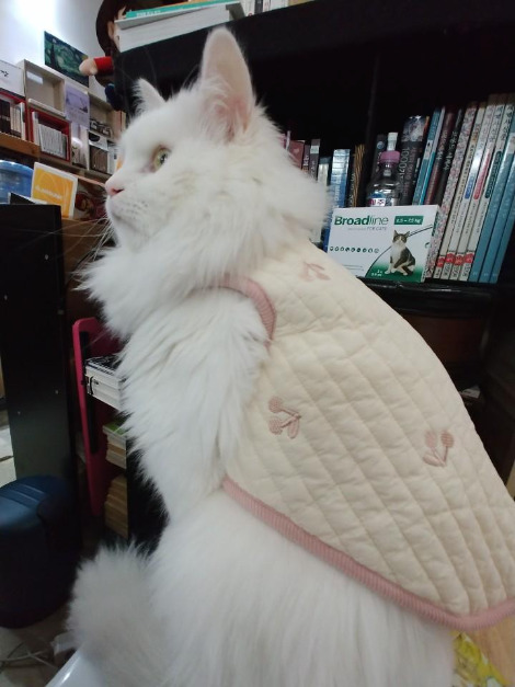 며칠 전부터 흉터에 송골송골 잔털도 보여 살갗을 감싸주고 있기도 하네요. 그래도 상처 부위가 그루밍으로 덧나지 않게 보호장치를 했답니다.