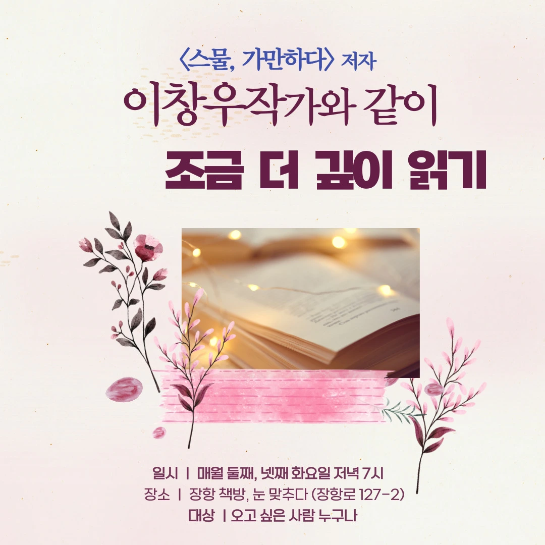 9월부터 다시 장항 책방으로 만날 장소를 옮겨 본다. 조금 더 깊이 읽기를 친숙한 공간에서 더하기로 하니 느긋해지는 마음이다.