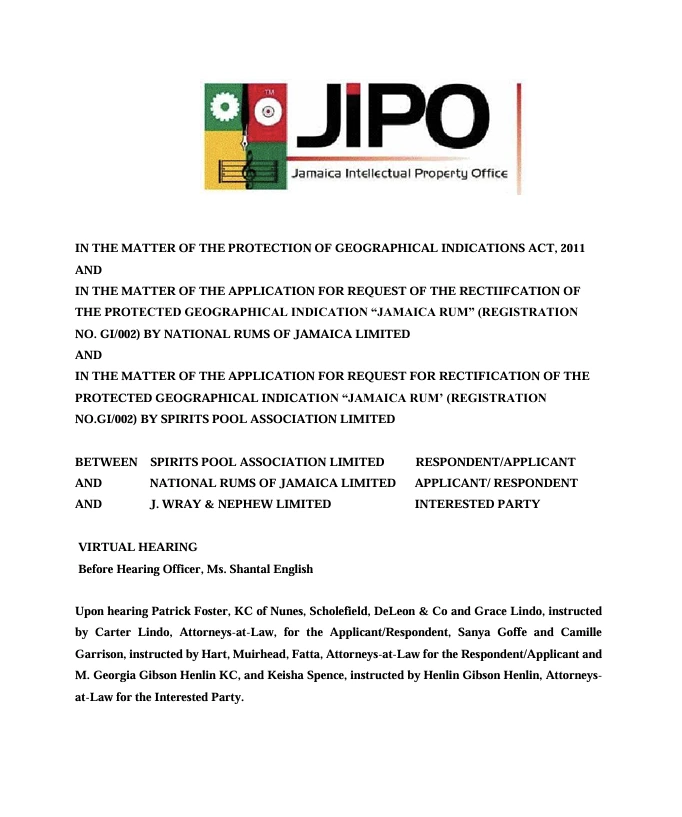(1) 2020년, NRJ(National Rums of Jamaica)가 자메이카 럼 GI 개정안 신청을 JIPO에 제출했다. 여기서 NRJ는 Clarendon, Long Pond 두 증류소를 소유한 자메이카 국영 럼 생산 회사이며 JIPO는 자메이카의 지식재산청이다.