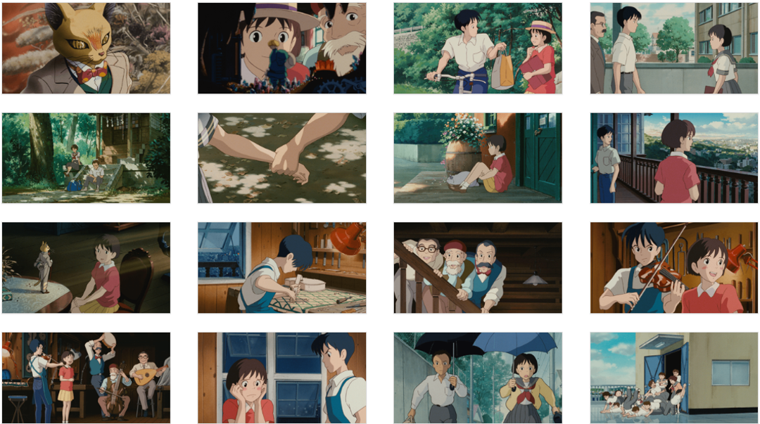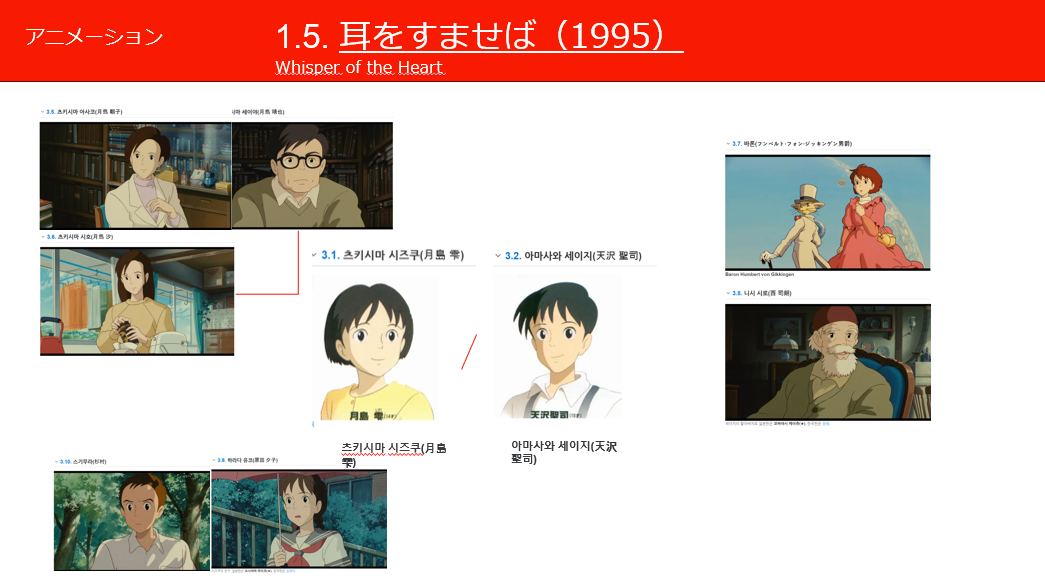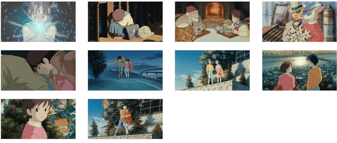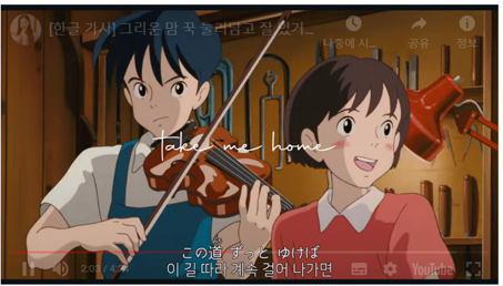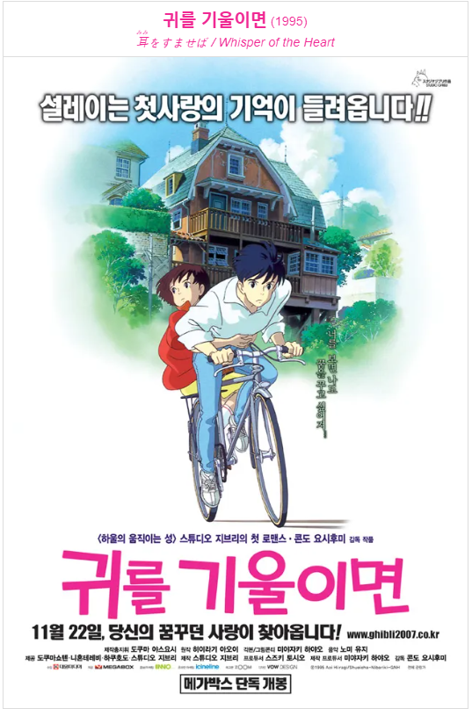 ‘귀를 기울이면’은 단순한 사랑이야기이지만 그 안에는 보석 같은 이야기가 있다. 덴슈언덕을 한 참을 뛰어내려 가서 도서관에 가는 길인데 도서관 앞에서 남자애가 자전거를 타고 와서 도시락을 건네준다. 콘크리트 로드 노래를 핀잔하면서. 아버지가 도서관에서 일해서 도시락을 가져온 것이었지만 남자애가 영 신경이 쓰였다.