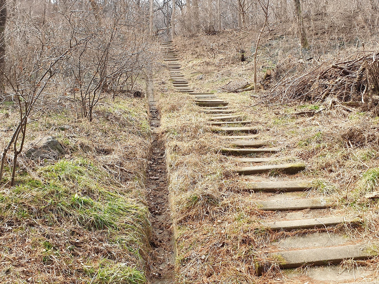 나무 계단으로 오르는 소박한 계단이 '천국의 계단'(天國의 階段 / Stairway to heaven, SBS 2003~2004) 같다. 봄 햇살에 나무들은 새싹을 돋아내려고 몸이 근질거릴 것 같다. 자연은 오르면 오를수록 경이로움을 느끼게 한다. 산을 오른다. 산은 어쩌면 늘 나를 기다리고 있지만 오라는 말도 가라는 말도 하지 않는다. 다만 산은 거기에 있을 뿐이다.