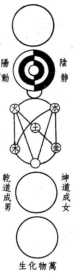 五行, 一陰陽也; 陰陽, 一太極也; 太極, 本無極也. 五行之生也, 各一其性. 오행은 하나의 음양이고, 음양은 하나의 태극이다. 태극은 본래 무극이다. 오행의 생성에 각각 본성을 동일하게 갖고 있다.