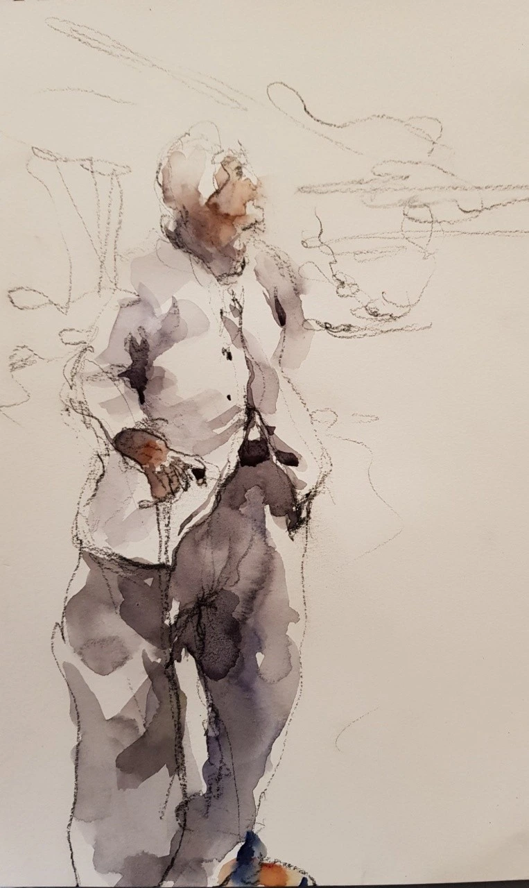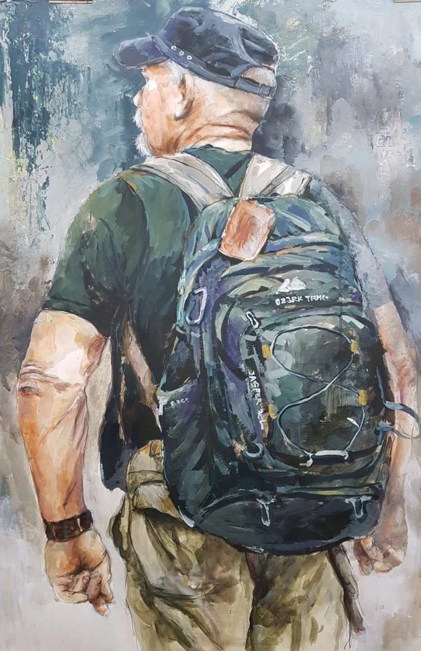 화폭에 남자는 머스테쉬가 있을 것으로 보아 백인 군인인데 은퇴한 것으로 보인다. 왼손이 팔 elbow에서 강인함에 느껴지고, 어깨와 등판에 단단한 근육을 빼놓지 않았다. 멋진 뒷모습니다.