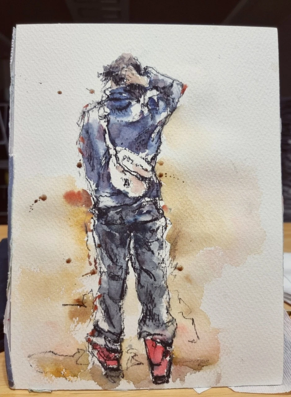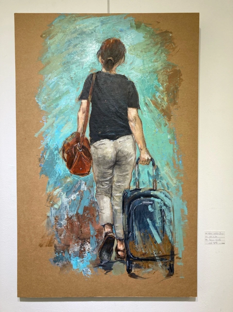 뒷모습에서 인물의 머릿결에 편히 묵은 머리띠, 그리고 머릿결이 흐트러진 것이 오히려 자연스럽다. 화자는 분명 강단이 있으며 여행에 대해 야무진 듯하다. 추정컨대 왼쪽 가방에는 아마도 그림도구들이 마구 담겨있을 것 같고 쇼케이스 안은 분주히 담은 옷가지들, 혹은 대충 찍어 최소한의 예의를 차릴 수 있는 화장품 정도일 것 같다. 그림의 성격으로 보아 그림에는 신경을 쓰나 얼굴에는 덜 신경을 쓸 것 같다.