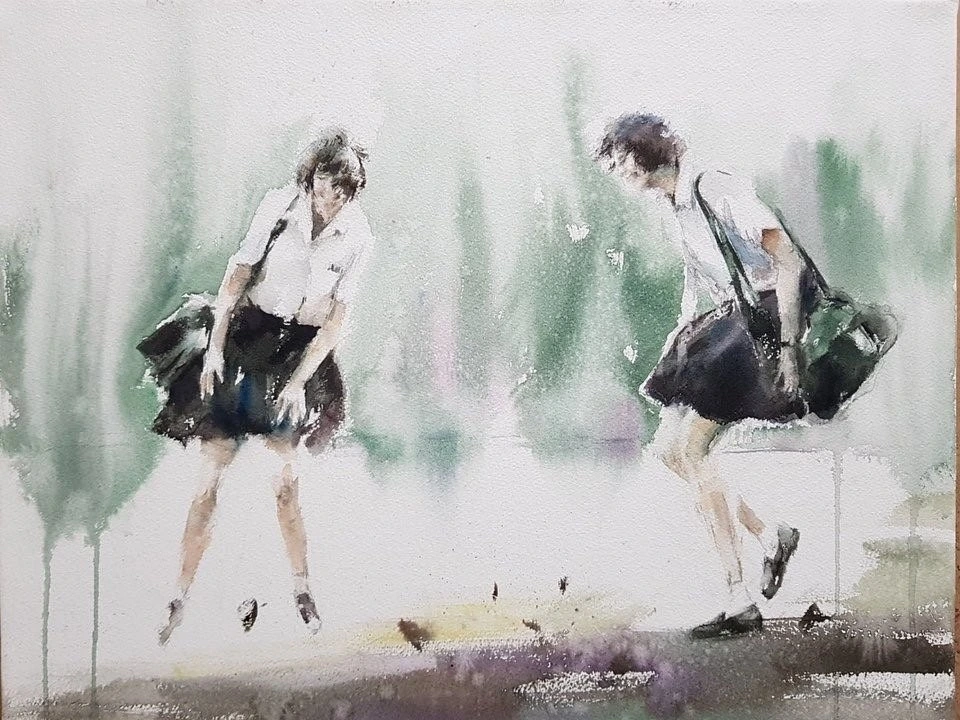 반팔과 치마로 보아 여름인데 뭔지 모르게 활기차 보이면서 쾌활하다. 왼쪽에 있는 소녀의 얼굴에 눈빛이 웃음이고 치아를 내밀고 웃는 기쁨이 있다. 뭔지 모르게 누군가를 골탕이라도 먹이고 화들짝 뛰어나와 웃는 느낌이다.