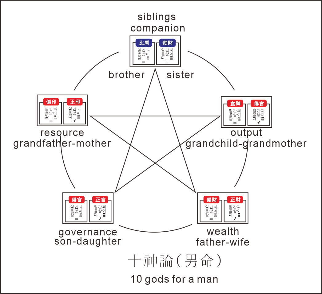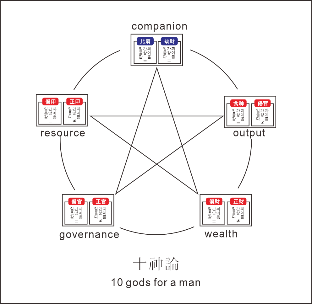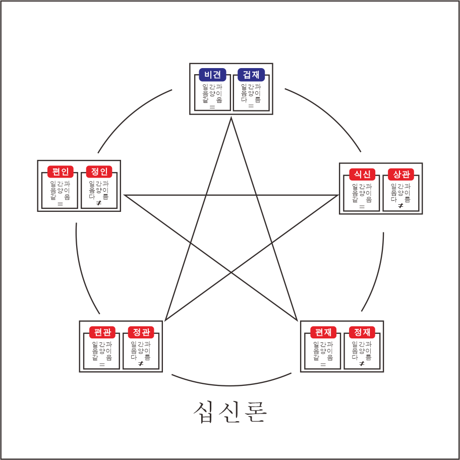 비견 겁재 식신 상관 편재 정재 편관 정관 편인 정인을 십신이라 부른다. 세부적인 논의는 본론에서 논의한다.