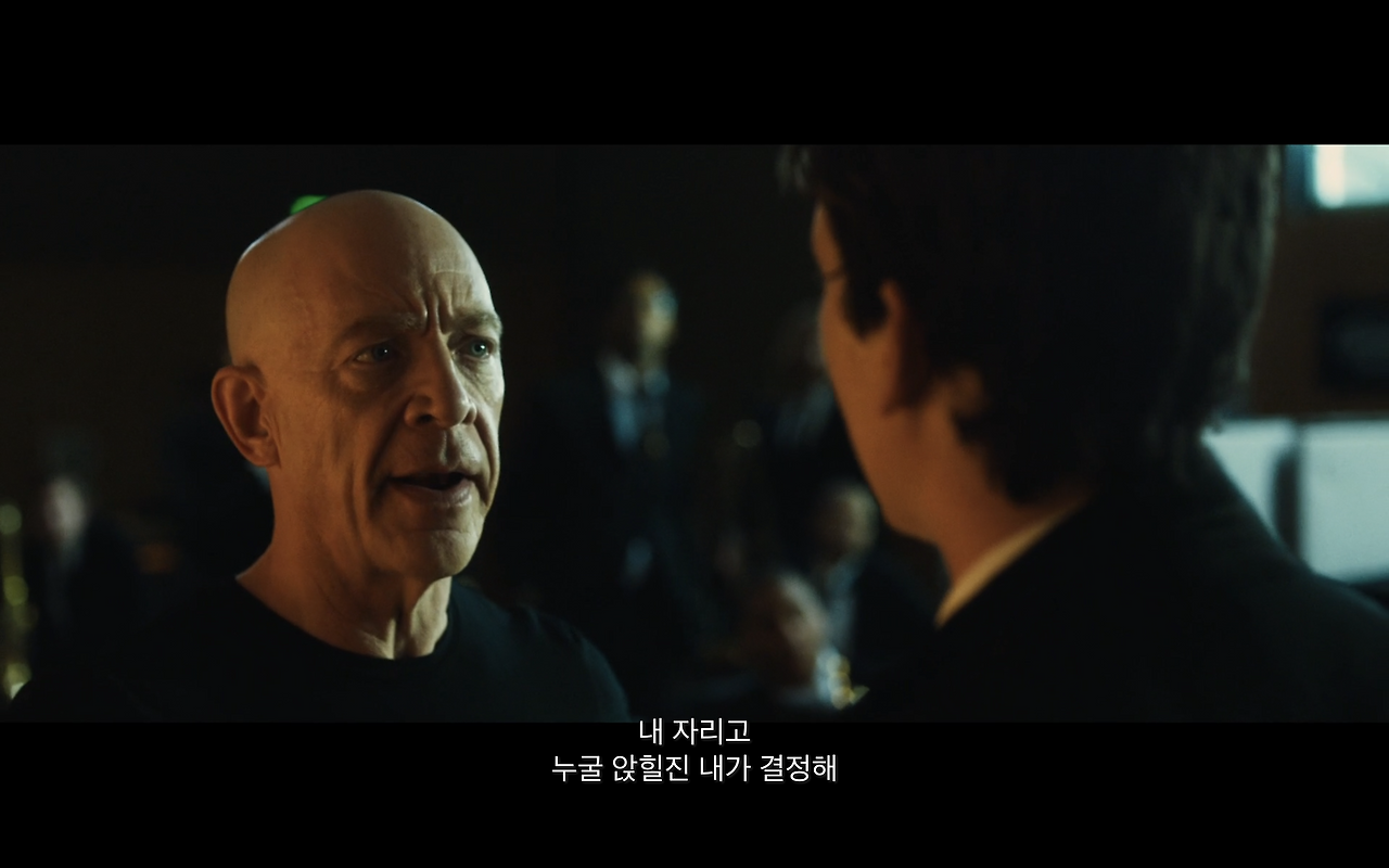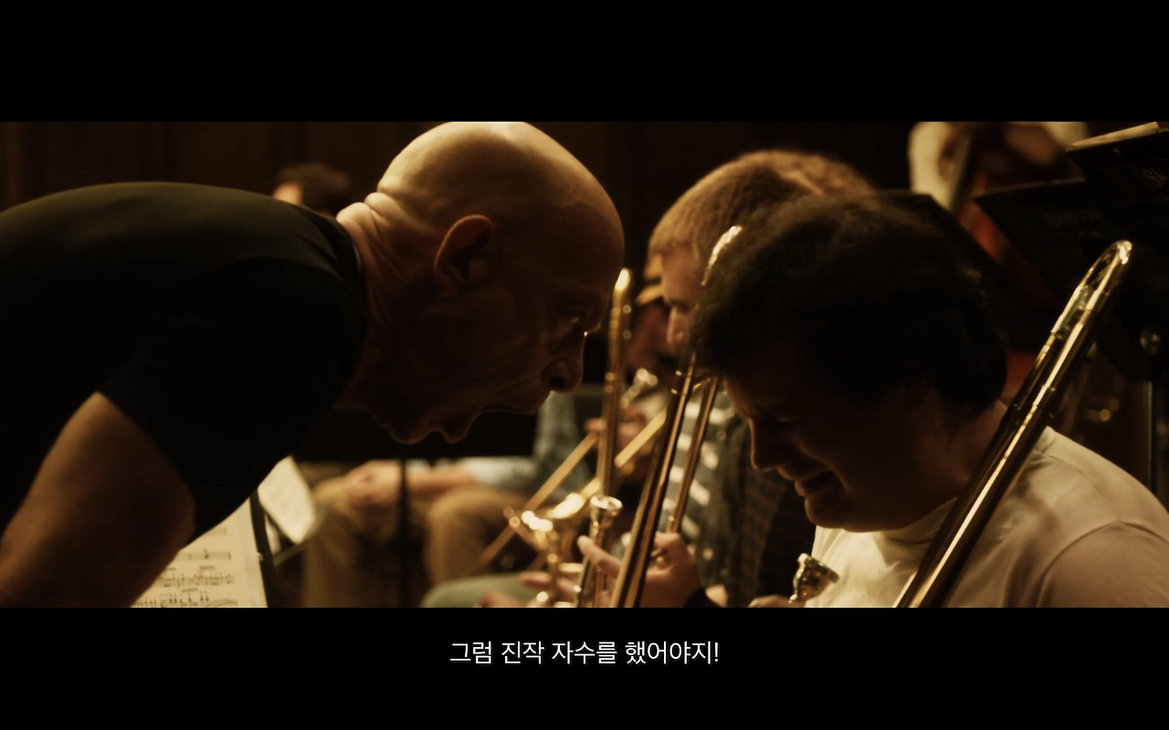 음알못인 내게 음악이라는 세계는 연주에서 문제를 찾기도 어려운, 뭐가 이상하고 어떤 게 다른지 하나도 모르는 세계다. 극 중 플레처가 문제를 지적하며 아무리 다시 연주해도 내 귀엔 똑같이 들리기만 한다. 그럼에도 까다롭고 예민한 플레처의 요구에 맞추고 연주하는 모든 이들이 수긍하는 모습을 보인다. 음악이란 세계엔 완벽함이라는 게 존재하는 걸까? 그게 아니면 플레처의 세계가 완벽을 추구하는 걸까? 어쩌면 그 미묘한 차이가 만드는 간극과 그 차이를 감지할 수 있는 감각이 플레처라는 인물이 권위를 얻게 된 이유인 걸까. 강박적이고 강압적인 플레처의 요구를 순순히 받아들이는 건 정말 모두가 플레처와 그의 음악을 존경하고 정답이라고 생각하기 때문인걸까?