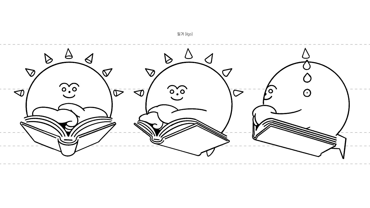 책과 펜, 잉크에서 모티브를 가져온 캐릭터니까 그 물건의 특성이 느껴지면서도 한가족처럼 느껴지길 바랐습니다. 우선 독서 모임이니 책을 모티브로 한 캐릭터를 메인 캐릭터로, 펜과 잉크를 모티브로 한 캐릭터는 서브 캐릭터로 정했어요. 우선 메인 캐릭터는 모임명인 '일거'를 그대로 썼습니다. 절대 이름을 새로 짓는 게 너무 힘들고 어려워서 포기한 건 아니고요...(정말로!) 책을 모티브로 했으니 '읽어'의 의미를 갖고 있는 '일거'만 한 게 없었습니다. 그리고 모임명인 일거와 동일한 작명 규칙으로 캐릭터 이름을 짓고 싶었기 때문에, 모임명과 중복되는 의미를 가진 이름을 하나 더 만들기보단 동일하게 하는 것이 더 좋다는 생각이 들었습니다. 메인 캐릭터를 정하고 작명 규칙을 정하니, 다음은 일사천리였습니다.