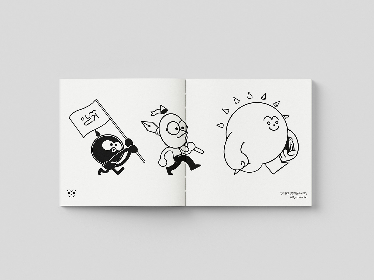 어둑이라는 설화와 전설을 배경으로 한 캐릭터였는데, 형태의 단순함과 동작 응용에 편의성이 있던 캐릭터였습니다. 흑백이라는 점도 디자인 유지 보수, 추후 확장성과 변형을 고려했을 때, 좋은 설정이라고 생각이 들었어요. ‘비주얼 콘셉트의 큰 줄기를 이 친구로 삼고 독서 모임에 어울릴 수 있게끔 손 좀 보면 되겠다!’ 생각을 하던 중에, 캐릭터 하나로는 부족하겠다는 생각이 퍼뜩 들더라구요. 모임이라는 정체성을 갖고 있는데, 캐릭터 하나만 달랑 있는 건 그 정체성을 전달하기엔 모자라다고 판단했습니다. 그래서 저는 눈물을 머금고 캐릭터 세트를 만들기로 결정했습니다.