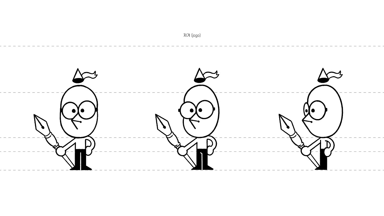저거(jogo)는 팔다리가 길고 마른 체형의 캐릭터로, 오래된 펜에 영혼이 깃들어서 생긴 도깨비라는 설정을 갖고 있습니다. 새 부리 같이 보이는 입은 펜 촉을 모티브로 했고 안경을 쓰고 있으며, 탐구하고 지식을 쌓는 것을 좋아해서 아는 게 많고 완벽주의를 추구합니다. 그래서인지 까칠하고 예민하며 신중하고 소심한 성격을 갖고 있습니다. 똑똑한 만큼 비판적이고 냉소적일 때가 종종 있어서 인지 '일거'나 '이거'처럼 사람들과 두루두루 친하게 지내진 못합니다. 하지만 문제가 생기면 인과관계를 파악하고 다각도로 분석해 가장 적절한 해결방안을 제시하는 해결사이기도 합니다. 스스로 문제를 해결하려는 주체적이고 독립적인 모습을 보여줍니다. '이거'와는 성격 차이로 자주 다투지만 늘 자신의 곁에 있어주는 '일거'와 '이거'를 가장 좋아합니다.