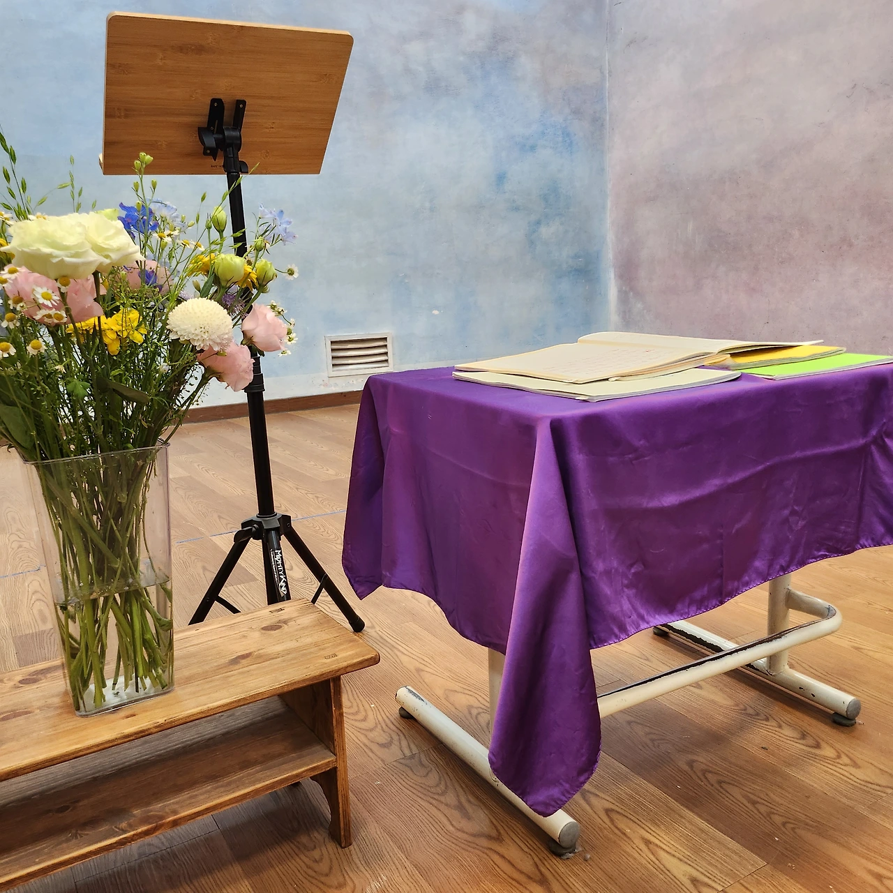 오이리트미 수업을 위해 무용복을 입은 선생님 한 분과 반주해주시는 선생님 한 분이 강당으로 오셨다.