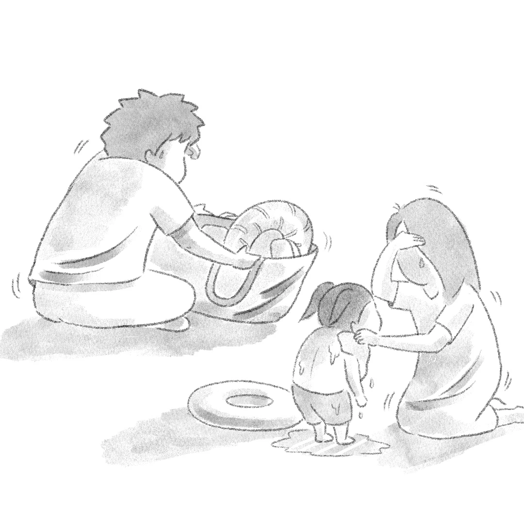 젖은 몸을 닦여주고, 옷을 갈아입히고,