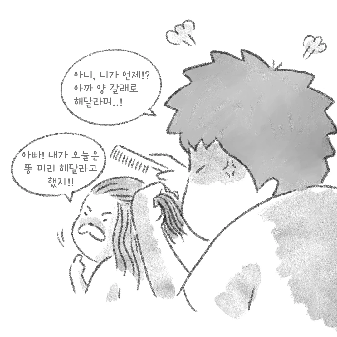 양갈래머리로 해달라고 했다가 잠시 후 자기가 한 말을 잊은 듯 똥머리로 해달라고 했다가 빗질에 머리카락이 조금이라도 당겨지기라도 하면 불같이 화를 내곤 한다