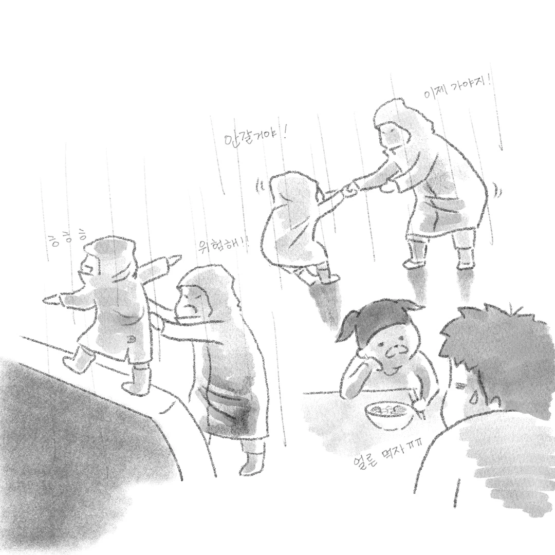 "비 내리는 날 우리 이거 입고 밖에 나가서 놀자~"
