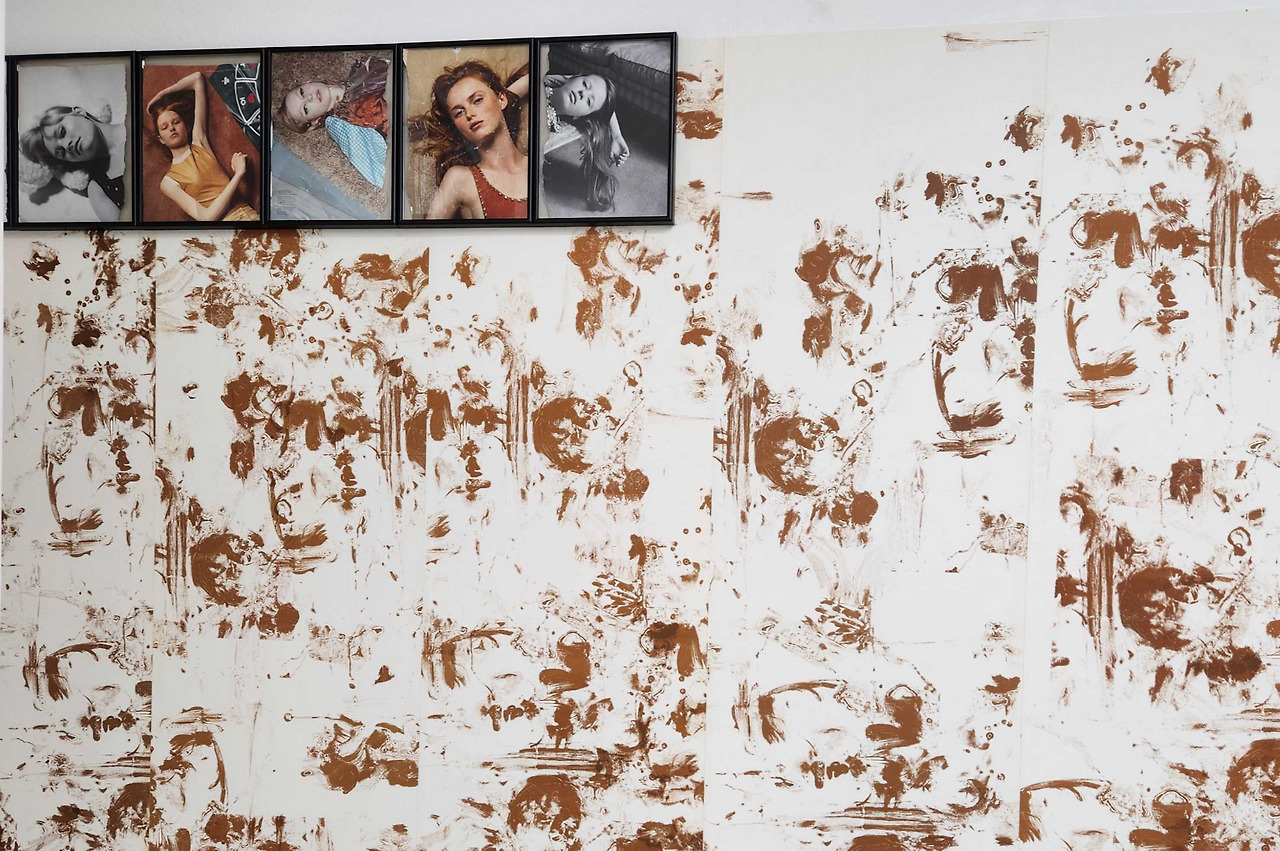갤러리 내부에는 <데이즈드 & 컨퓨즈드 &> 시리즈가 벽지처럼 사방에 펼쳐져있다. <데이즈드 & 컨퓨즈드 &>의 좌측상단에는 잡지에서 오려진 여성들의 사진이 액자에 담겨있다. 액자 속의 여성들은 자신의 머리카락을 우아하게 뽐내며 늘여놓고 있다. 액자 속 여성들에게 첫 시선을 빼앗긴 후 주위를 둘러보면, 액자 속 여성들의 머릿결이 흘러내리듯 자연스럽게 주변으로 시선이 옮겨진다. 하지만 액자와 함께하고 있는 갈색 흔적들은 액자 속 여성들의 우아함과는 거리가 멀다. 갈색의 흔적들은 스트레스를 받을 때 머리를 긁으며 이리저리 헤집어 놓은 것처럼, 분주하게 산발적으로 긁혀 있다. 그래서일까, 역동적으로 펼쳐져 있는 페인팅은 매력적인 그녀들의 이면에 있는 삶의 흔적처럼 느껴지기도 한다. 액자 속에 전시된 아름다운 여성들의 우아함과 난잡한 페인팅들의 대비는 아이러니하게 느껴진다. 그녀들의 흔적 같으면서도 이질적이기 때문이다.