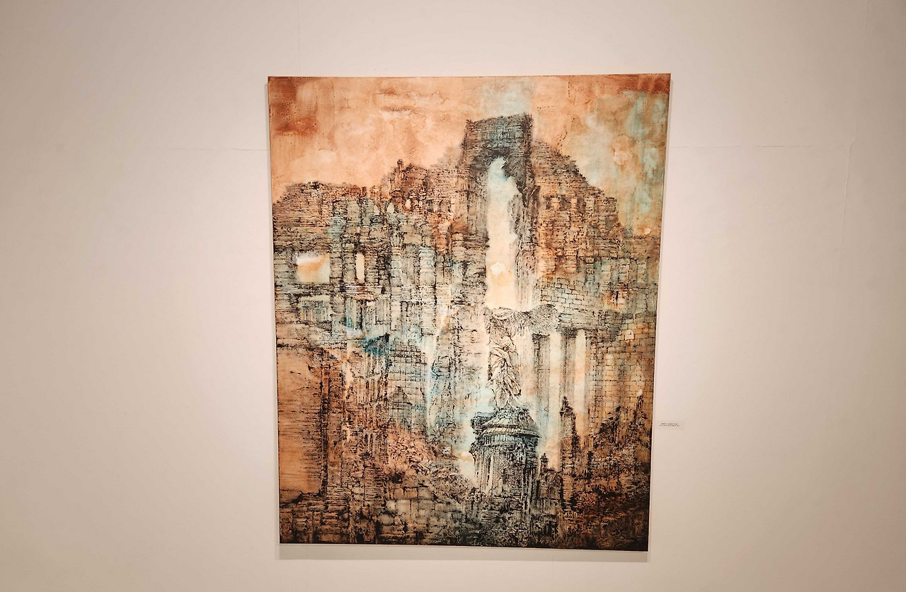 정건우 작가의 <Ragnarok-Redemption of ruins>는 어딘가 익숙하지만 어디에도 없는 장소를 묘사하고 있다. 승전을 기념하기 위해 세워졌던 승리의 여신 니케의 동상이 작품 속에서는 폐허 속에 방치되어 아이러니한 분위기를 만들어낸다. 그리고 니케의 뒤에 펼쳐져 있는 건축물들은 어떤 시대의, 어떤 문화의 것인지 모호한 상태를 통하여 관람자에게 흐릿한 기시감만을 전해준다. 풍화되고 방치되어 폐허가 되어버린 건축물들에서는 정적인 분위기가 주위를 맴돈다. 인간의 생활이 느껴지는 활력이 전부 소진된 것처럼 보이기 때문이다. 그런데 엄밀하게 표현하면 작품 속의 장소는 폐허가 '되어버린'것이 아니다. 왜냐하면 이 장소는 그 어느 곳에도 존재하지 않았기 때문이다. 그러므로 폐허가 되기 이전의 온전한 상태는 애초에 존재하지 않았다. 작품 속에는 오로지 흐릿한 기시감 만이 맴도는 폐허의 이미지만이 존재한다.