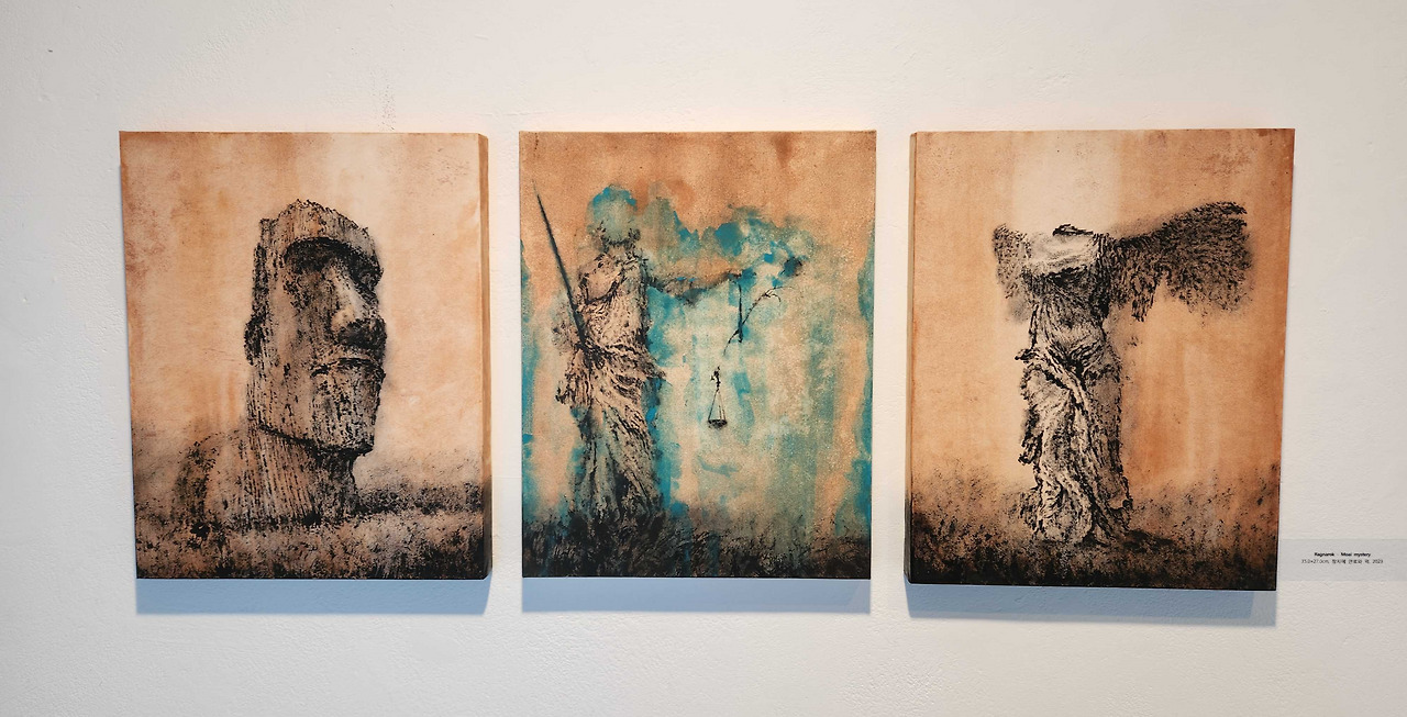 작가는 혼재된 풍경을 담아내는 작업 외에도, <Ragnarok-Moai mystery> 외 2점과 같이 여러 이미지들을 전시하는 작업 또한 시도하였다. 작품들 속 조형물들은 특정 서사들을 함축하고 있는 대표적인 이미지들이다. 하지만 작가가 묘사한 작품들 속 조형물들이 경건하거나 고귀하지만은 않다. 이것들에 앞서 해체됨을 앞둔 그늘짐이 작품들을 에워싸고 있는 듯, 비통함과 침울함이 먼저 관람자에게 다가온다. 자극 과잉의 사회 속에서, 서사들의 단절을 통해 가벼워진 이미지들과 우리의 관계가 소통보다는 소비에 가까워짐을 느낀다. 혼란스럽게 소비만을 반복하여 도달하는 폐허의 풍경을 정건우 작가는 자신의 작업을 통해 우리에게 전해주고 있다.