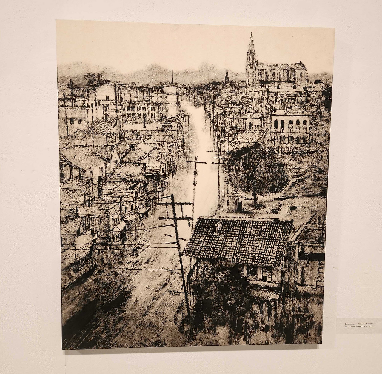 작가의 <Documentary-Accordion Perfume>에는 여러 가지 문화 양식의 건축물들이 나열되어 있다. 일본풍의 가옥부터, 이슬람풍의 발코니, 유럽풍의 성당, 그리고 전신주까지, 이색적인 건축물들이 하나의 장소에 혼재되어 있다. 이와 같이 만국박람회처럼 이질적인 것들이 모인 장소는 전형적이지 않다. 이곳은 전통적인 이미지들이 나열되어 있지만, 특이하며 새롭다. 그러나 정건우 작가의 작업은 작품 속 장소를 박람회와 같은 전시장으로 묘사하지 않는다. 작가는 이미지들이 그저 혼재된 풍경으로 이질적인 것들을 담아내고 있다. 모두 어딘가 본 듯한 이미지들, 하지만 그것들이 모여 하나의 서사를 이루지는 않는다. 작품 속 이미지들은 각기 자신의 위치에서 부유하고 있을 뿐이다. 이렇게 하나의 서사로 통합되지 못한 채 부유하는 이미지들은, 하나의 균일한 법칙으로 정갈하게 유지되고 있는 것이 아닌, 와해되어 방치된 폐허와도 같은 상태로 남겨져 있다.