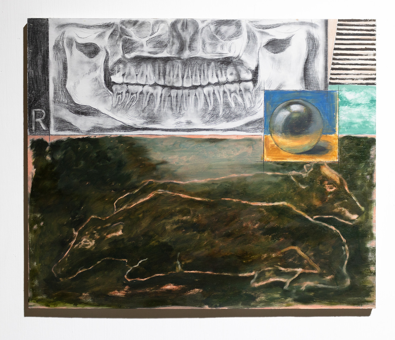 거리감은 인간이 세계를 인식하기 위한 자연스러운 태도 중 하나이다. 우리는 거리 속에서 사유하고, 관조하고, 분석한다. 김유림의 작업은 바로 이 거리감의 관조를 실천한다. 젖소와 인간 사이에 놓인 울타리는 분리의 기호이자, 관조의 조건이다. 그러나 이 거리감은 차이를 영원히 고정하기 위한 것이 아니라, 차이를 응시함으로써 그 차이의 윤리적 가능성을 사유하게 만든다. <교차로 위의 불청객>에서 등장하는 구강 파노라마 엑스레이 이미지와 젖소의 실루엣은 이 거리감을 다층적으로 구성하는 장치다. 젖소는 죽음 이후의 부재를 암시하듯 배경과 겹쳐 자리하고, 엑스레이 이미지는 식별가능에 대한 고유성의 의문을 담는다. 이러한 것들이 과연 그 존재를 대변할 수 있는 기호들일까? 이러한 보편 개념(universal)[2] 으로서 개체를 대하는 거리감 속에서, 관객은 그들을 응시하며 간접적으로 —그들을 고유성을 지닌 개체로 바라보지 않는— 보편적 시선에 동참하고, 그리고 이 동참으로 발생하는 관조는 다시 의문으로 이어진다.