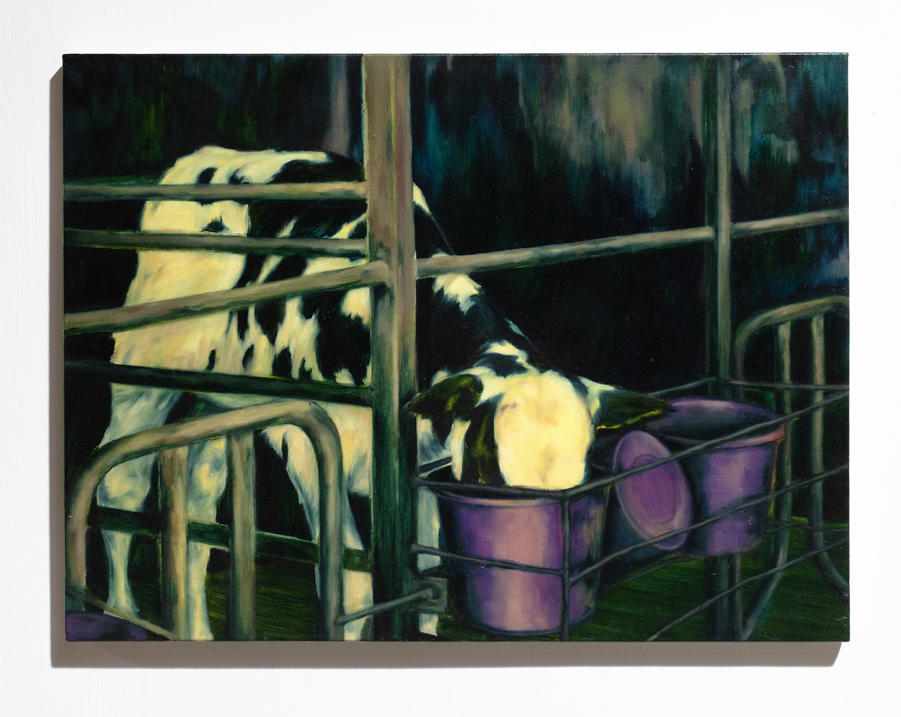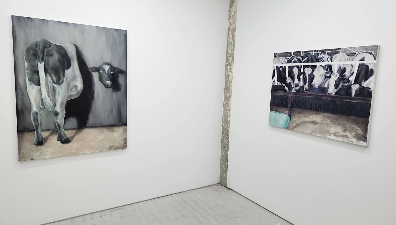 김유림의 작업에는 다양한 시선으로 전제되는 울타리가 자리한다. 울타리는 타자화의 시작이자, 우리가 세계를 분할하고 의미화하는 기초적이며 일상적인 도구이다. 작가의 작업에서 울타리는 젖소를 둘러싼 시선과 구도 그리고 프레임에 구획된 시선 속에 은밀히 위치한다. 이 울타리는 시선의 둘러싸임 이자 인식의 틀이며, 동시에 정체성의 경계로 자리매김한다. 이때, 젖소와 인간으로 나뉘어진 구획—먹는 자와 먹히는 자, 응시하는 자와 응시당하는 자, 분리하는 자와 분리된 자와 같은—은 능동/수동의 상징적 구도를 가진다. 작가는 이러한 구도를 교란하면서도, 프레임 안에서 그것이 작동하는 과정을 시각화한다. 여기서 울타리는 분리의 기호로서 작동하여, 차이를 인식하고 성찰할 수 있도록 만드는 시선의 조건이다. 따라서 우리는 작가가 그리는 ‘저 너머’의 젖소들에게서 거리감을 느낀다. 그들은 건너편에 있기에 우리가 아니다.