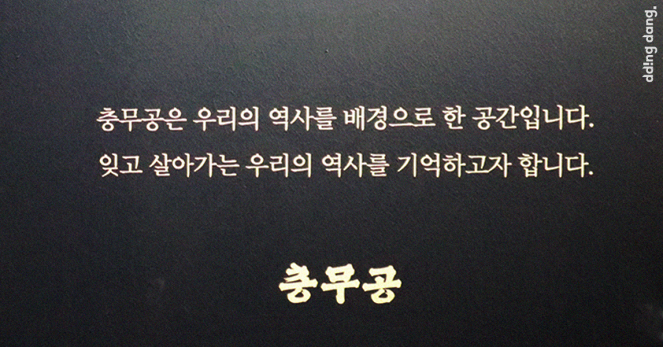 충무공 카페에는 들어서자마자 보이는 문구가 있습니다. "충무공은 우리의 역사를 배경으로 한 공간입니다. 잊고 살아가는 우리의 역사를 기억하고자 합니다." 이 문구를 보면 커피가 아무리 일상적인 것이라고 해도 이곳을 만든 사람의 마음만큼은 결코 쉽지 않았구나 생각하게 됩니다.