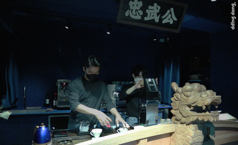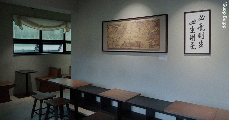 대한민국 국민이라면 모를 이가 한 명도 없는 이순신 장군의 호를 카페 이름으로 쓴다는 것은 오히려 카페 이름으로는 반감이 일어날정도로 위험한 선택일 수 있습니다. 하지만 그만큼 자신감을 뜻하는 선택이기도 하죠. 들어가기 전부터 웅장하게 펄럭이는 깃발에서 예상했지만, 그 안은 더 경이롭기까지 합니다. 충무공 그 이름 한 글자에 누를 끼치지 않으려는 마음이 진심으로 와닿기에 이미 눈은 이리저리 굴려 구경하기 바쁩니다.