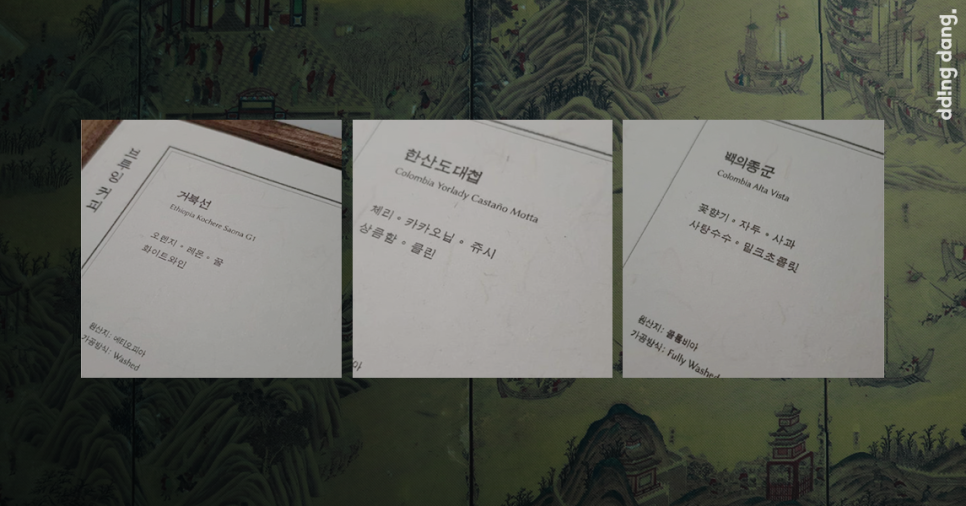 거북선은 실제 거북선을 보면 느껴지는 것처럼 개성이 분명한 커피를 취급합니다. 한산도 대첩은 학익진 전술처럼 생두 생산 과정이 현대 과학기술에 접목되어 있는 커피입니다. 백의종군은 말 그대로 기본에 충실하여 단맛, 고소함, 구조감이 매우 좋습니다. 이렇게 커피 이름들이 특이하다 보니 메뉴를 고르는 손님들은 자신도 모르게 구글링을 하게 됩니다. 이처럼 스토리를 가진 원두들이 이곳의 콘셉트를 더 확고하게 하여 풍미를 더합니다.