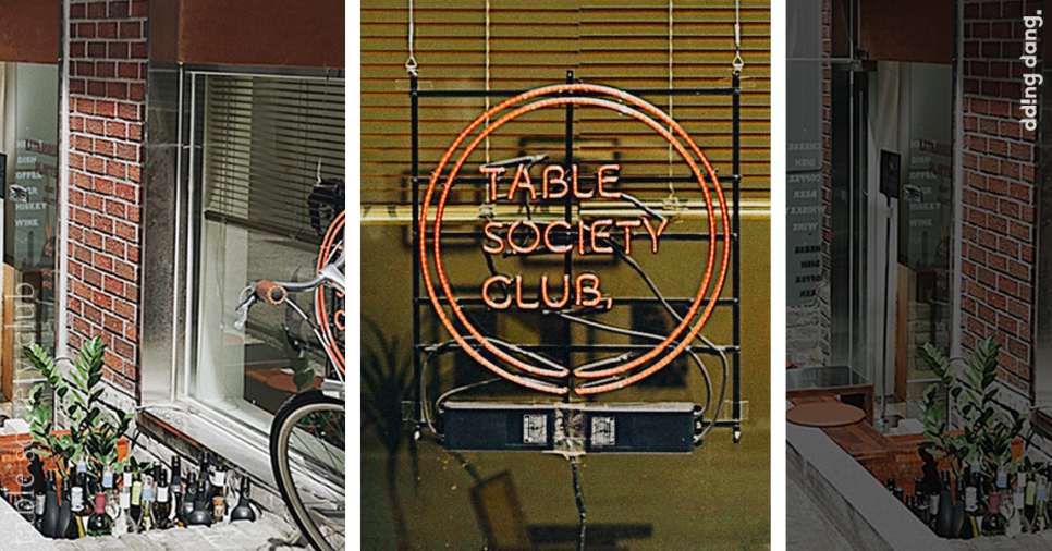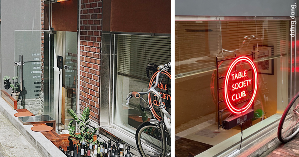 빨간 벽돌이 보이는 건물들 사이로 좁은 골목길이 여기저기 여러 갈래로 뻗쳐 있는 서울의 브루클린 성수동. 이 길가에 주택가구나 하고 그냥 지나치려다 은은한 오렌지색 불빛이 골목길 밖으로 새어 나와 눈길을 사로잡는 곳이 있습니다. 저곳에는 뭐가 있을까? 하는 궁금증을 가지며 다가간 그곳에서 테이블 소사이어티 클럽이라고 써진 간판을 볼 수 있었습니다.