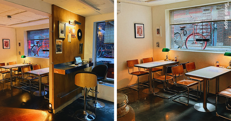 너무 만족하고 있습니다. 처음에는 만족도가 꽤 좋았는데, 요즘엔 자꾸 욕심이 나서 가끔씩 공간을 다듬기도 합니다. 애정을 담아 만든 공간이라 일하는 것도 늘 즐겁고요. 전 처음 키 콘셉트를 아메리칸 다이닝과 소셜 클럽으로 잡았어요. 이것들은 60~70년대의 미국에 상징적이었던 것들이고 개인적으로 그런 분위기를 좋아해서 통 창이 있는 상가를 찾았는데 운이 좋게도 이곳에 딱 있어서 바로 계약을 하게 됐습니다. 이 마주 보이는 파란 벽돌집들도 마음에 들고요.