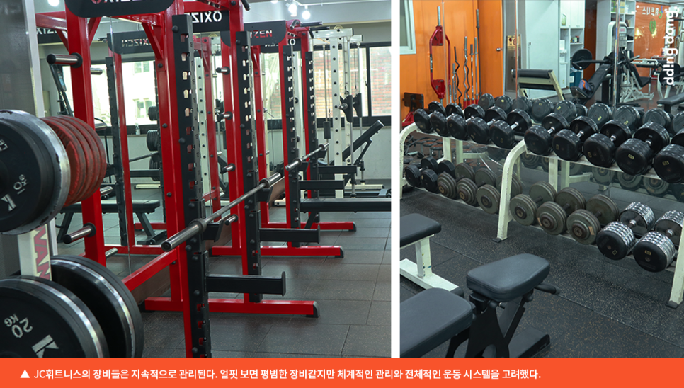 자세히 들여다보면 놀랍도록 멋진, 환상적인 체육관도 있는 법입니다. JC피트니스가 그렇습니다. 놀랍도록 멋진 마음과 장비 덕후라면 알아봄직한 환상적인 기구들, 그거면 되는 거죠. 나를 변화시키는 것은 작은 발걸음입니다. JC는 11년간 누군가의 작은 발걸음 한 번을 위해 쉽게 발 디딜 수 있도록 그 자리에 변함없는 모습으로 있는 중입니다. 매일 기름칠로 단장하고서 말이죠.