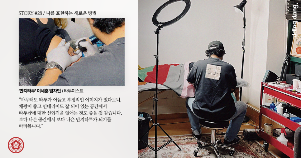 이세훈 임차인이 타투샵은 공간과 위치에 크게 영향을 받지 않는다면서도 결국 좀 더 높은 곳, 좀 더 밝은 곳을 원했던 것도 그 때문 아닐까요? 기억과 추억을 위해 타투하는 사람들의 타투받는 그날마저도 좋은 기억이 되는 것이 불사의 타투이스트가 가진 바람이었을지도 모릅니다.