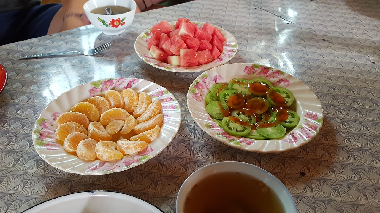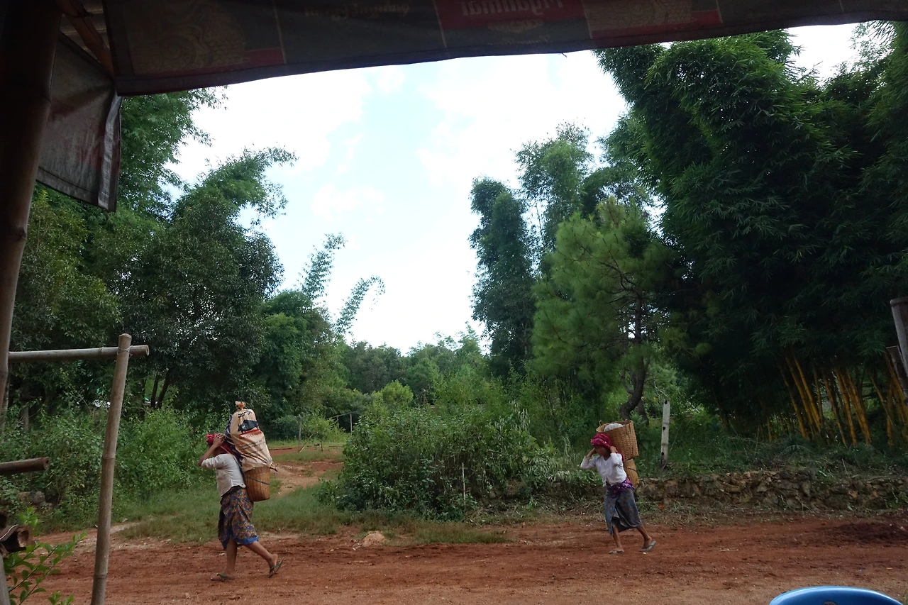정오가 되자 드디어 점심을 먹기 위해 한 민가에 들렀다. 정성스럽게 담아온 과일과 볶음 국수가 모두 맛있었다. 원래 여행 다닐 때 뭘 많이 먹는 편이 아닌데 이상하게 미얀마 여행때는 먹는 양도 늘고 뭘 먹어도 맛있는데다 많이 걸은 탓에 저 때도 내 앞에 있는 국수 한 그릇을 뚝딱 비웠는데 나머지 멤버들은 벨기에 남자 말고는 아무도 국수 한 그릇을 먹질 못했다. 거의 반은 남기고 있었다. 그렇다고 과일도 그닥 많이 먹지 않아서 국수도 혼자 싹 비우고 과일도 싹싹 비워 먹은 내가 왠지 식탐쟁이같이 느껴졌다.