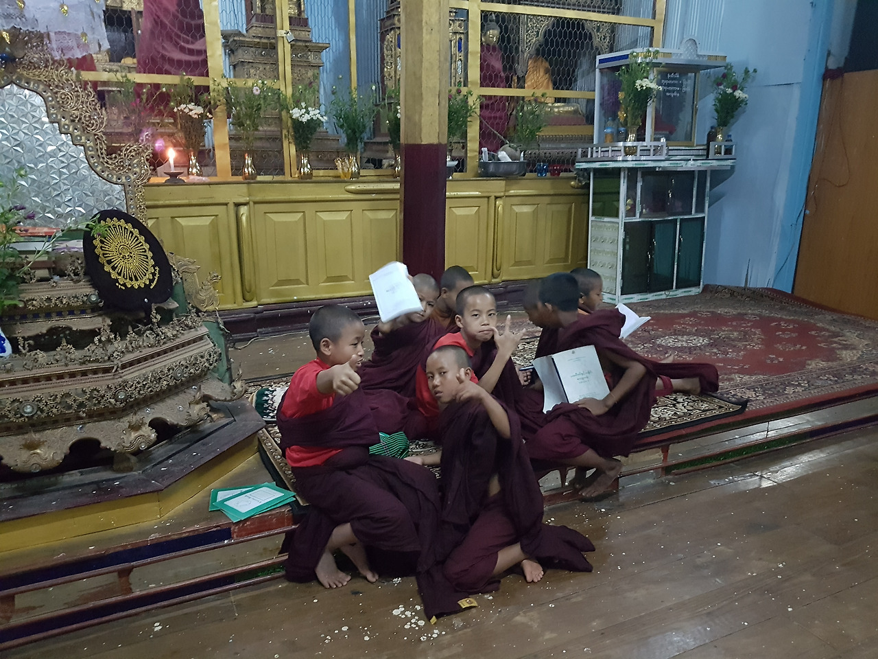 10살 전후의 동자승들에게 내 무기는 바로 모두의 관심을 사로잡을 만큼 매력적인 것이었다. 처음 밍글라바라고 할 때까지만 해도 수줍어 하더니 보이스 번역기로 말을 걸자 너도 나도 핸드폰에 대고 말을 하고 싶어 난리가 났다. 오고 가는 대화는 별 것 없었으나 대화 내용이 중요하겠는가. 그들에겐 이 처음 보는 신문물로 장난치는 게 더 중요한 꼬마들이었다.