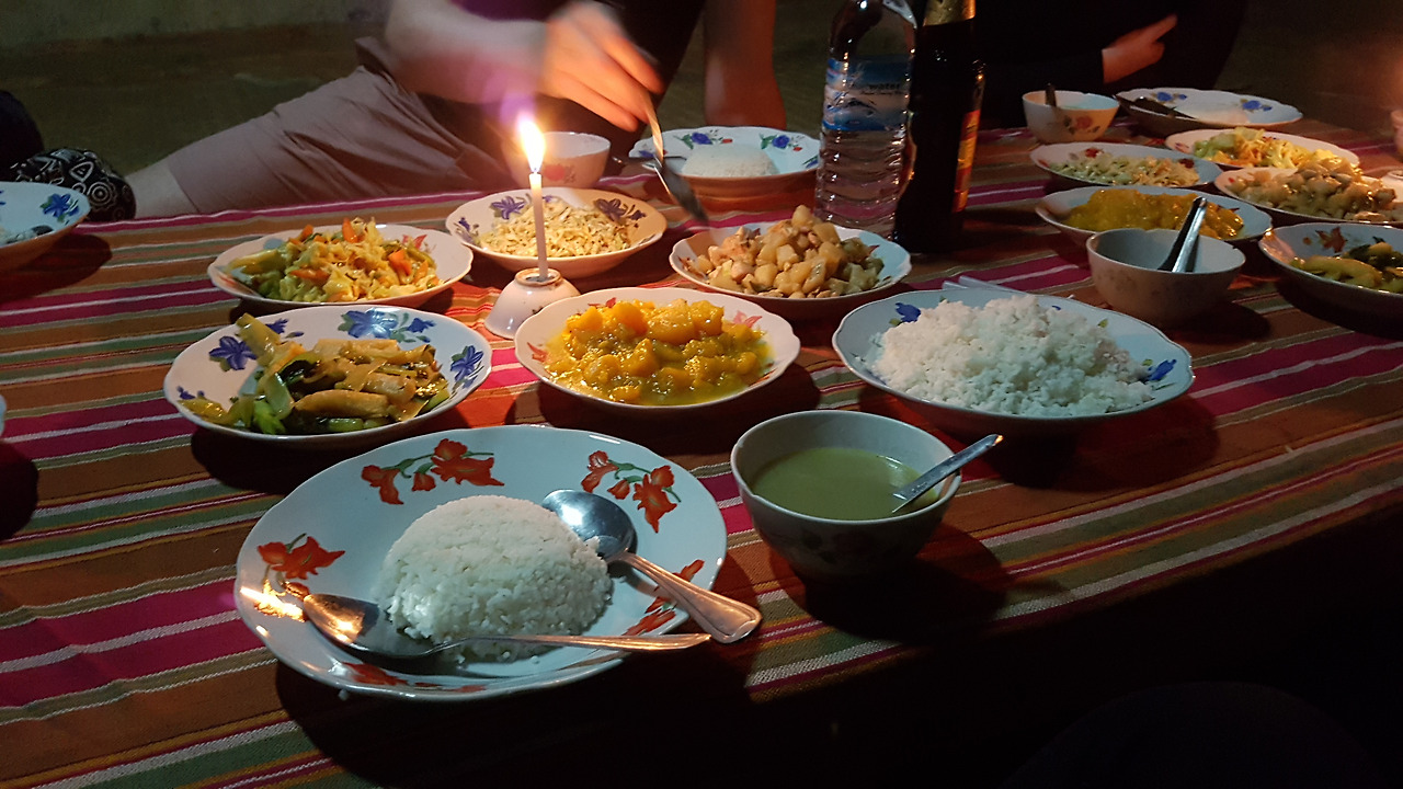 드디어 식사가 차려졌는데 식사도 전에 전기가 나가버렸다. 깊은 산골에 있는 절이다 보니 전력이 부족했던 모양이다. 엉겁결에 예상치 못한 꽤 분위기 있는 저녁식사를 하게 되었다. 제리는 우리와 함께 식사하지 않고 음식만 내다 주고는 사라져 버렸고 7명만이 분위기 있는 식탁에 둘러앉았다.