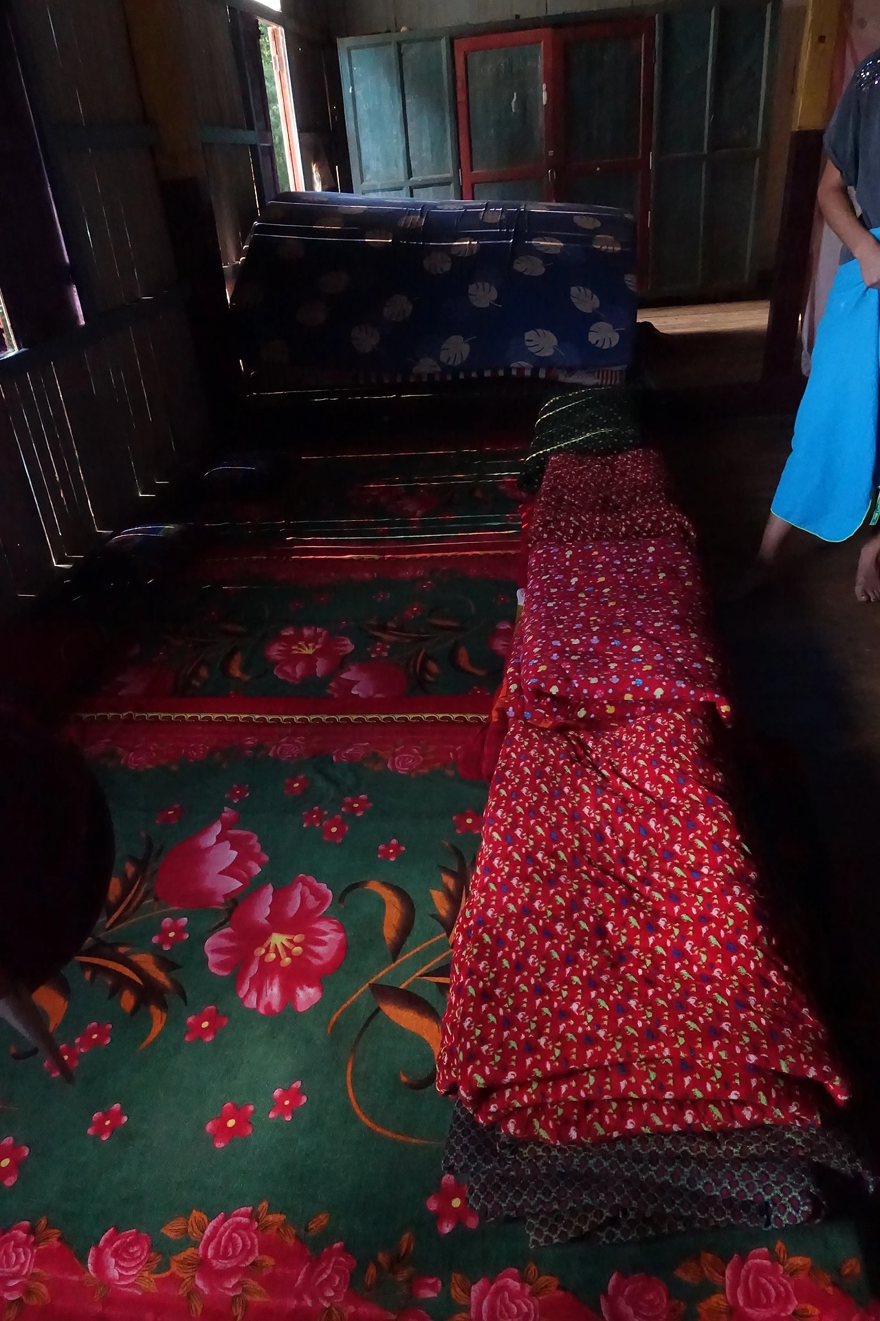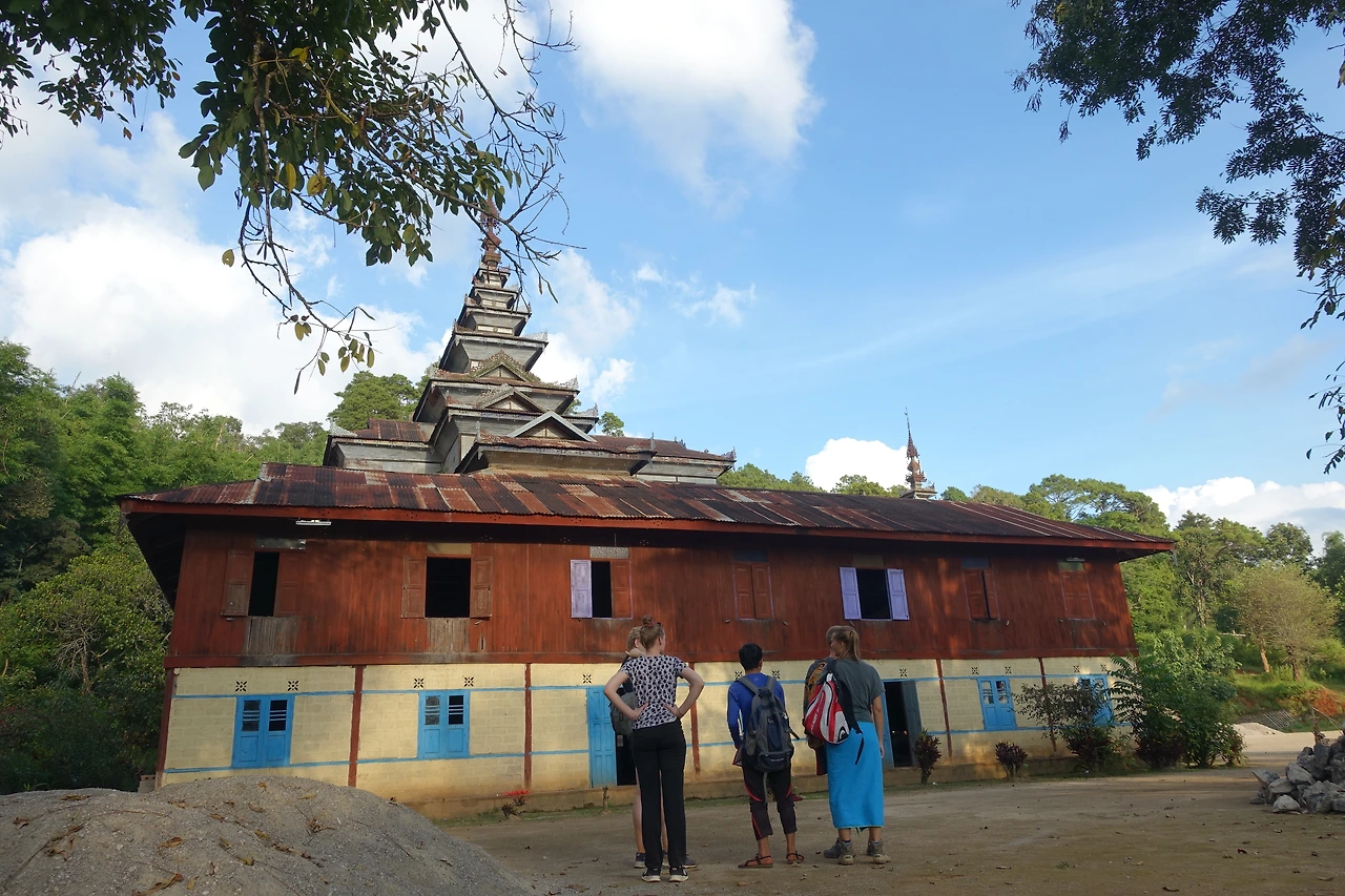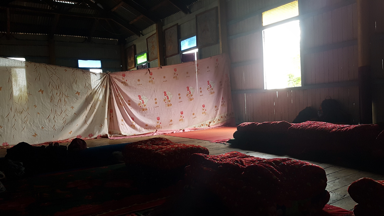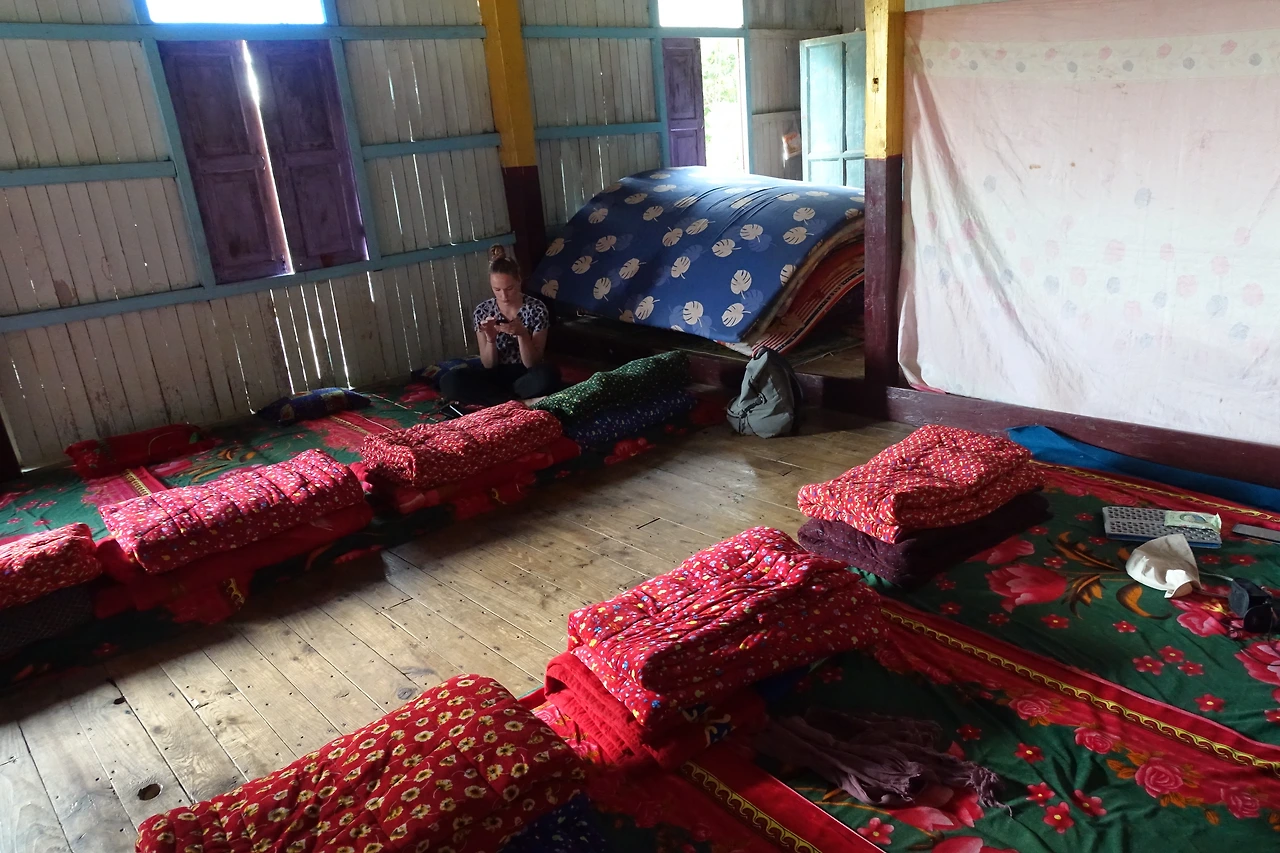 오후 4시가 넘어섰을 때쯤 우리가 하룻밤 묵을 산속 깊은 절에 도착했다. 양철지붕과 양철 불탑이 있는 산속 절에는 어린 동자승들과 스님들 그리고 그들을 돕는 남자 몇 명이 거주하는 곳이었다. 우리가 잘 곳은 대법당 한편에 천으로 칸막이로 공간을 나눠놓은 구석이었다. 우리 옆 천막에는 올 때 만났던 2박 3일 팀이 머물 곳이었다. 천막 안으로 들어가자 담요 7세트가 양쪽으로 깔려 있었다. 나는 이나, 로미 옆에 자리를 잡았다.
