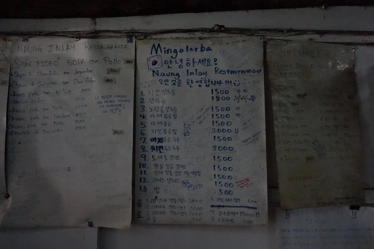 그리고 가장 중요한 맛은 왜 이 작은 식당에 저 다양한 언어의 메뉴판이 걸려 있는지 충분히 납득되는 맛이랄까 너도 나도 서로서로에게 먹어보게 해주고 싶은 맛, 아주머니의 음식 솜씨를 여러 사람에게 쉽게 맛보여 주고 싶은 맛이었다. 이렇게 맛있는걸 고작 3000짯에 먹을 수 있다니 감동 그 이상의 감동이었다. 그저 내 양의 한계가 딱 저기까지인 게 아쉬울 따름이었다. 평소엔 대식가들이 그다지 부럽지 않지만 이런 순간엔 정말 끊임없이 맛있는걸 맛볼 수 있는 대식가들이 부러워지곤 한다. 하지만 아침에 아저씨께서도 그러시지 않았던가? 뭐든 적당한 게 좋다고 적당하게 맛보고 적당하게 배부를 때 내일을 기약하며 인레 식당의 만찬을 마무리 지었다.