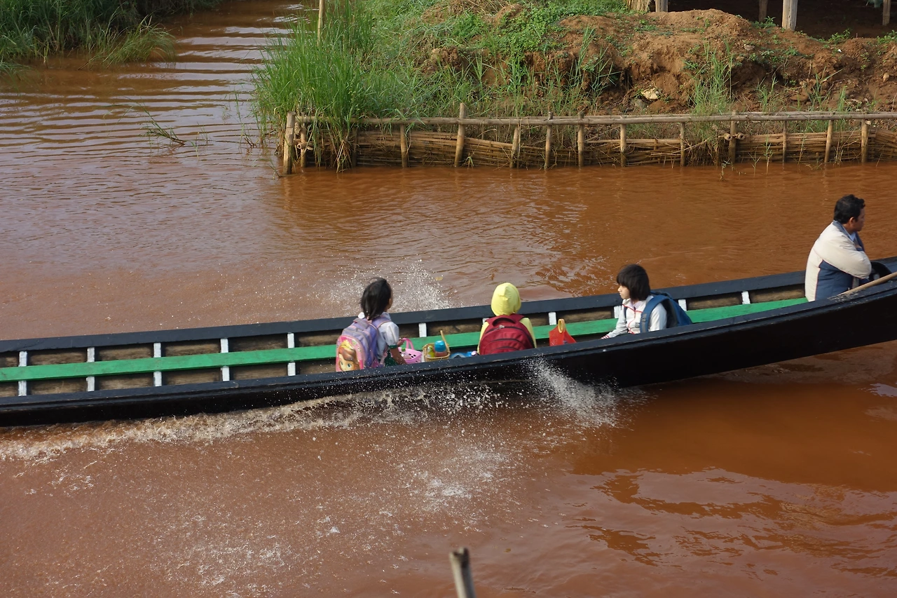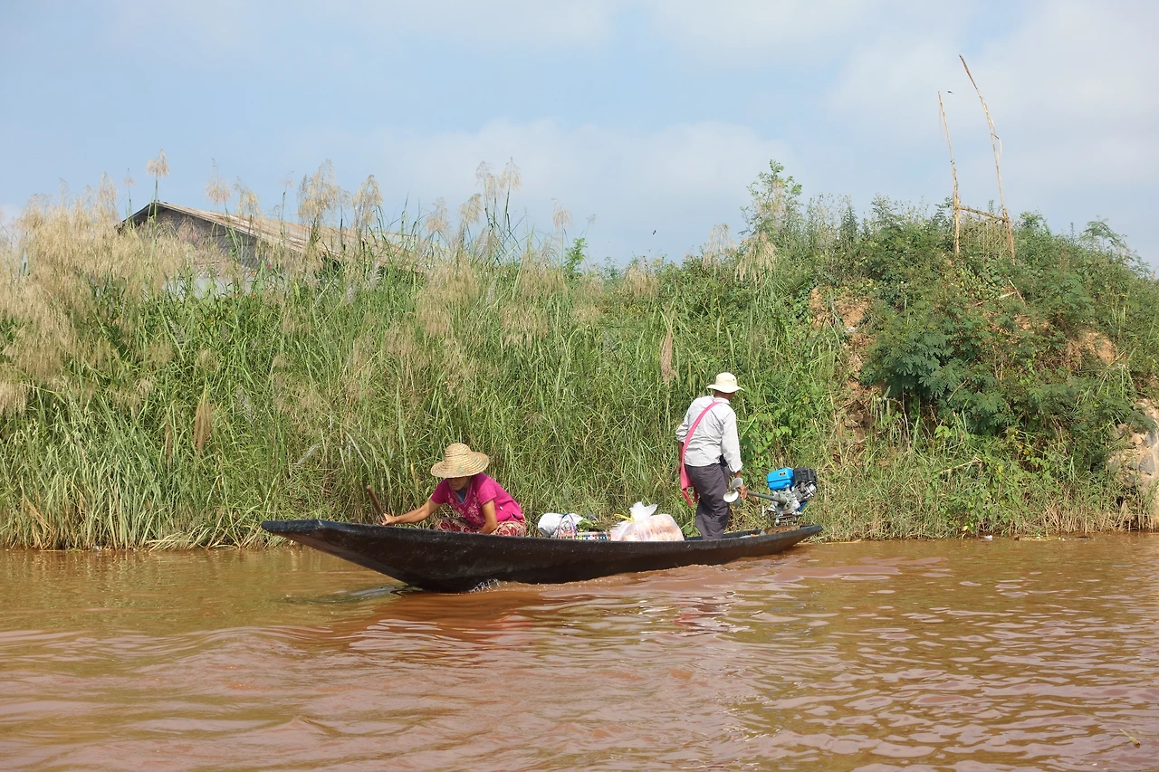 스위스인 한 명, 영국인 한 명, 싱가포르인 한 명, 한국인 한 명, 국적도 제각각 나이도 제각각 5시 반이 되자 숙소 앞에 우릴 태우고 부둣가로 가줄 픽업트럭에 올라타고 부둣가로 도착하니 인레에 올 때 탔던 배와 비슷한 작은 쪽배 한 척이 우릴 기다리고 있었다.