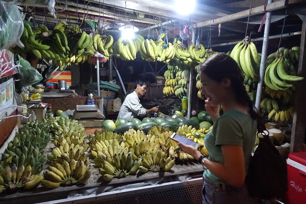 트란 언니처럼 재밌는 부분만 즐기면 될 일인데 이상하게 내 눈에 눈살 찌푸리는 그런 장면들이 들어왔다. 이미 너무 지쳐 있었기 때문일지도 모르지만 슬슬 이 거리에 점점 지쳐갔다. 하지만 즐거워하는 트란 언니 옆에서 지친 기색을 낼 수는 없었지만 인파에 막혀 100미터를 30분 이상이나 걸려 나가야 할 때는 어이가 없어서 헛웃음이 터져 나오고 말았다. 트란 언니와 다니며 제일 재밌었던 구간은 핼러윈 파티로부터 벗어난 뒷골목에서 바나나를 사러 갔을 때였다.