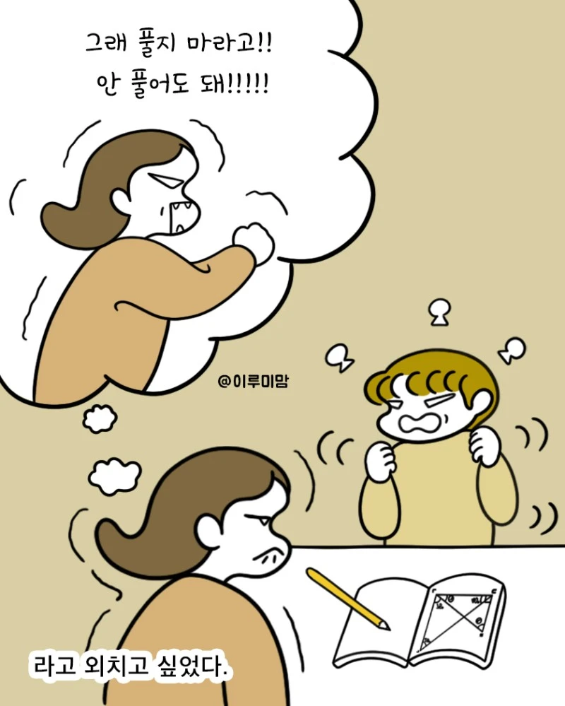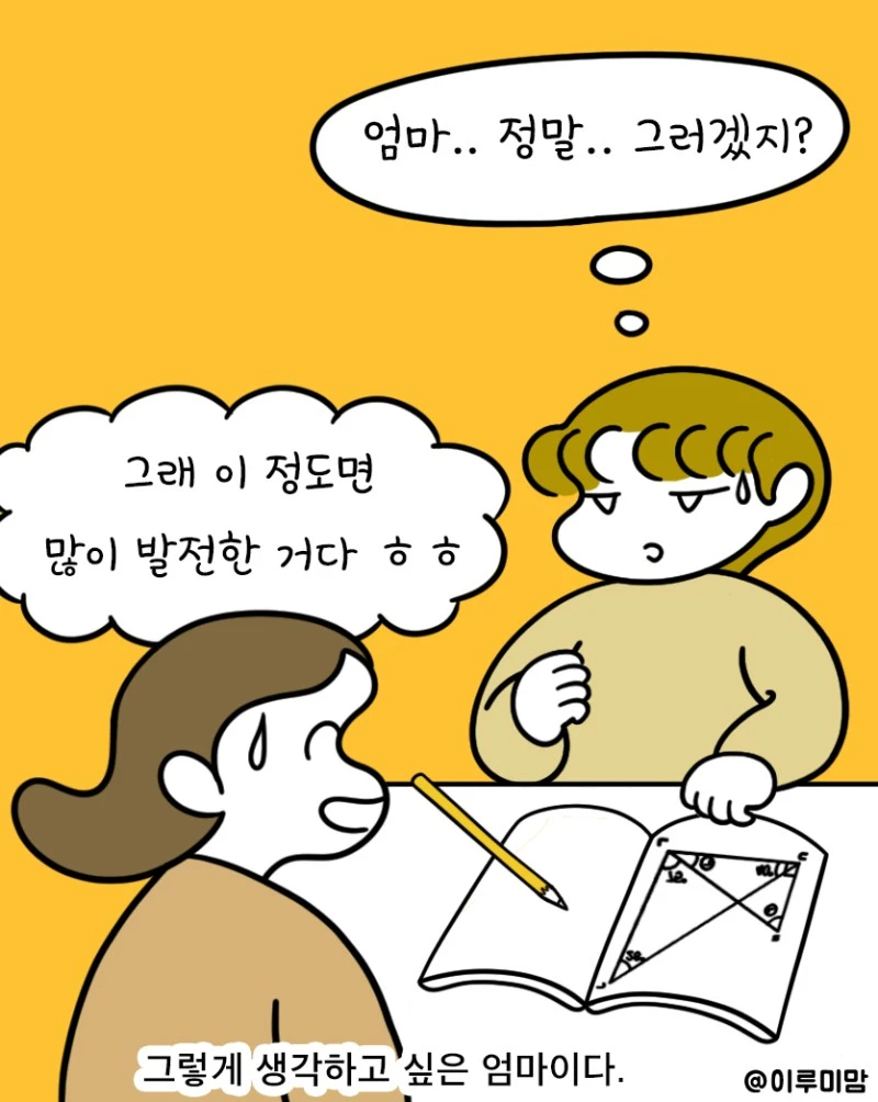덕분에 감정 조절이 쉽지 않은 초등 저학년 시기에는 어려운 수학 문제를 접했을 때 버럭 화를 내고, 다음에는 이런 유형의 문제가 나왔을 때 시도하지 않은 경우가 많았다. 하지만 점점 아이가 자랄수록 생각도 자라나는지, 지금은 엄마의 이야기를 듣고 마음을 가라앉히는 모습을 보이기 시작했다.