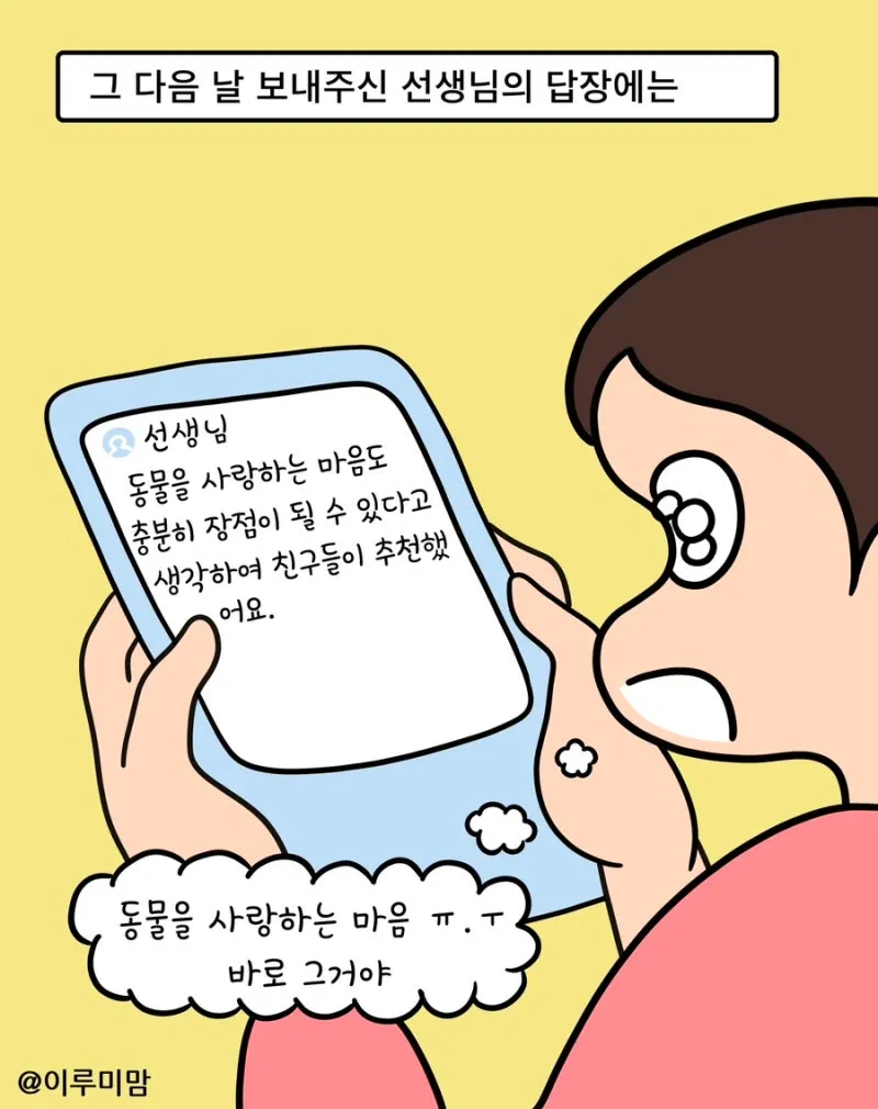동물을 사랑하는 마음도 충분히 장점이 될 수 있다고 생각하여 친구들이 추천했어요.
