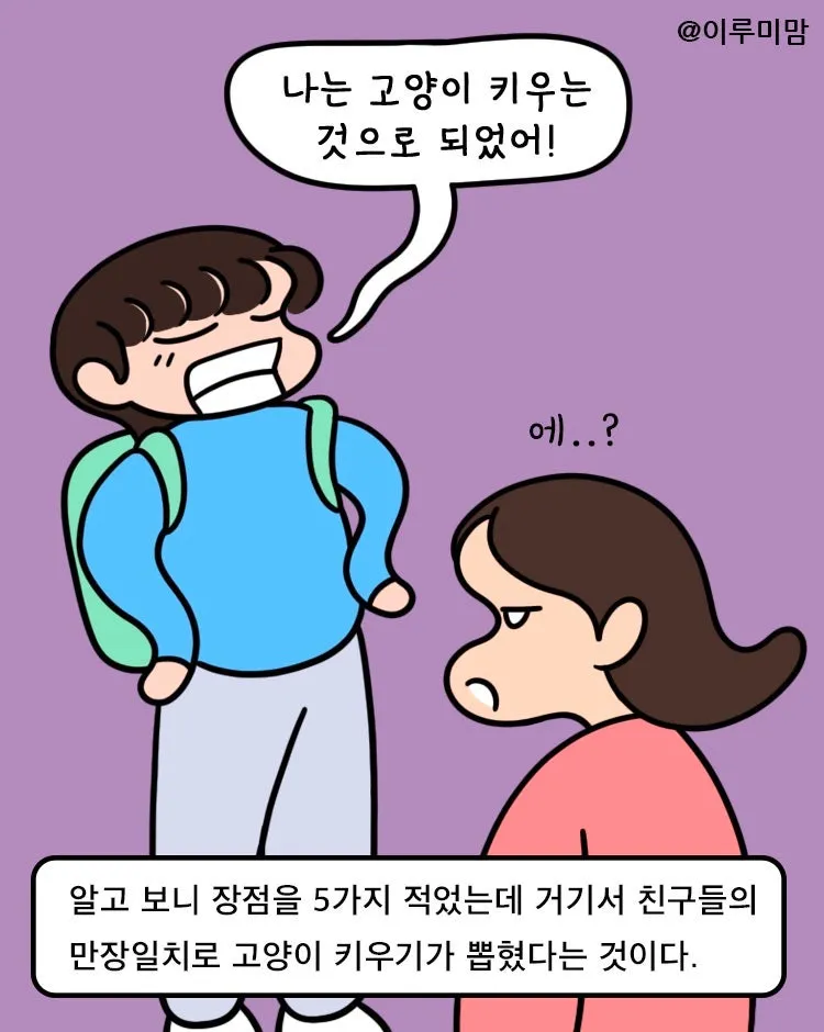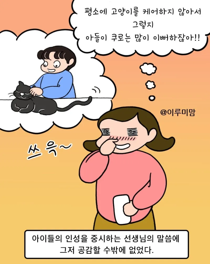 그동안 엄마인 내가 고양이를 키웠다고 생각해서 그런지 아이의 장점이라 여기지 않았던 모양이다. 하지만 가만히 생각해 보면 아이는 평소에 고양이를 이뻐했다. (물론 어렸을 때는 엄마는 고양이만 이뻐한다고 아들의 귀여운 질투의 시기도 있었지만 ㅋㅋ 아이는 자라면서 고양이를 생각하는 마음이 점점 커져갔다.)