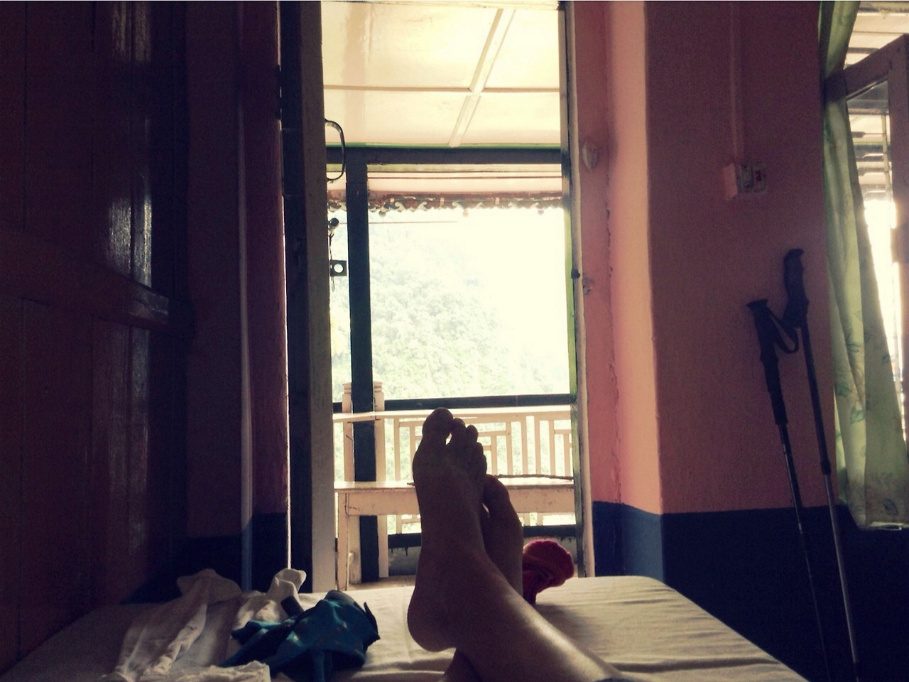 "누웠을 때 보이는 오늘의 풍경. 바람 소리, 새소리, 사람들 말소리까지 하나하나 다 좋다. 아무것도 하고 있지 않아도 그저 좋다. 몬순 기간이라 트레킹을 걱정했다고 하니까 포터는 자기는 오히려 몬순 기간이 좋다고 하며 사진을 보여줬다, 꽃들이랑 풀들이랑 하얀 산까지 너무 예쁜 풍경. 얼른 만나고 싶다. 힘들어도 견뎌내야지. 설산 설산. 내 인생의 첫 설산.