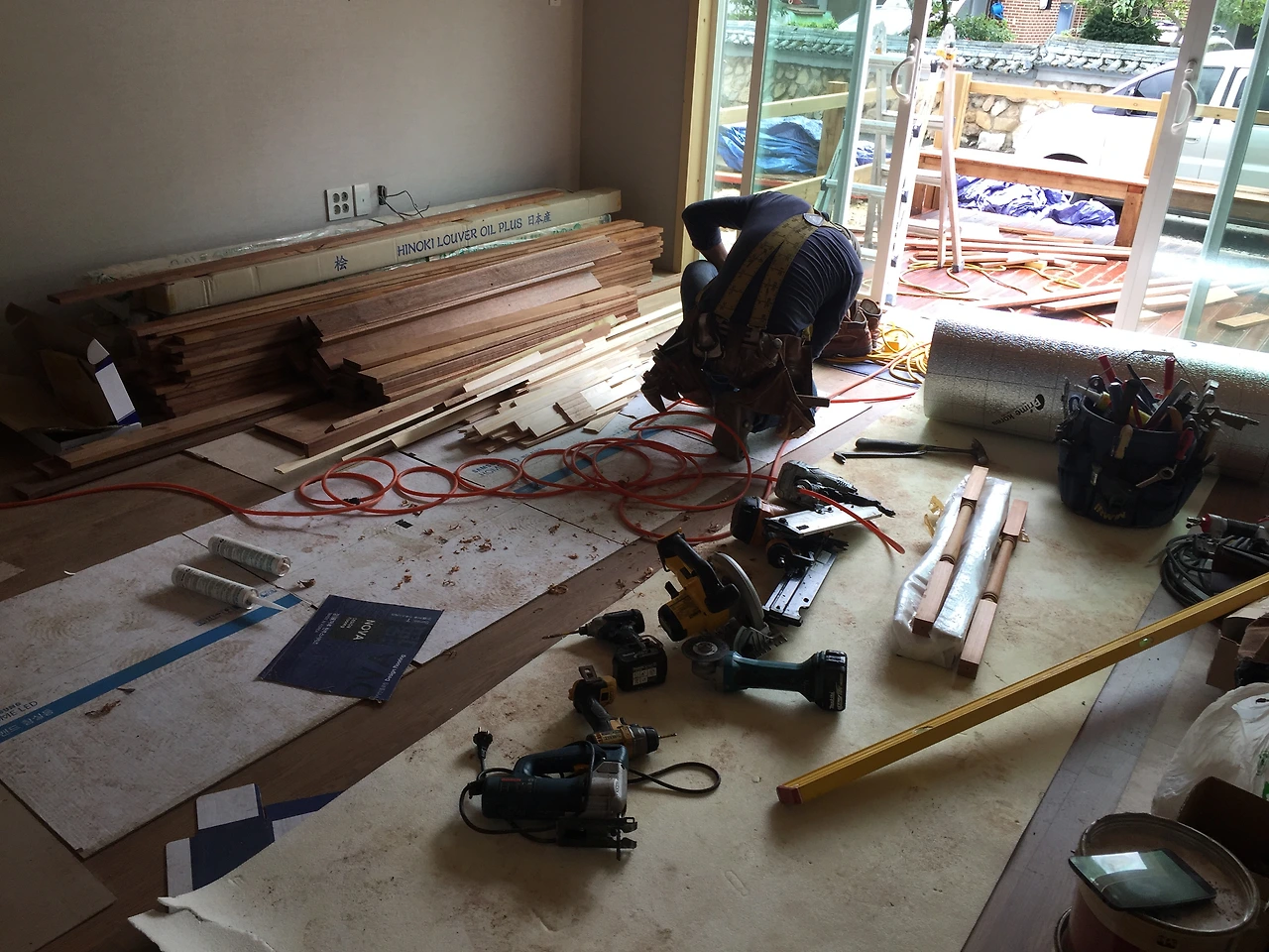 이 일을 5년을 한 사람도 만났고 9년을 한 사람도 만났고 16년을 해온 사람도 만났다. 60이 넘은 고집 센 사내도 만났다. 집을 짓는 목수에 대한 애정은 왔다 갔다 한다. 제대로 집을 짓겠다는 마인드를 지닌 사람은 드물었다. 목수. 내가 생각하는 진짜 목수에 가까운 사람을 만났다. 운이 좋았다. 1년 정도를 그의 팀에서 일했다. 그는 유쾌하고 흥이 있는 사람이었다. 술에 취한 날이면 그와 죽마고우처럼 키득거렸고 일하는 날엔 그의 잔소리를 들으면서 일을 배웠다.