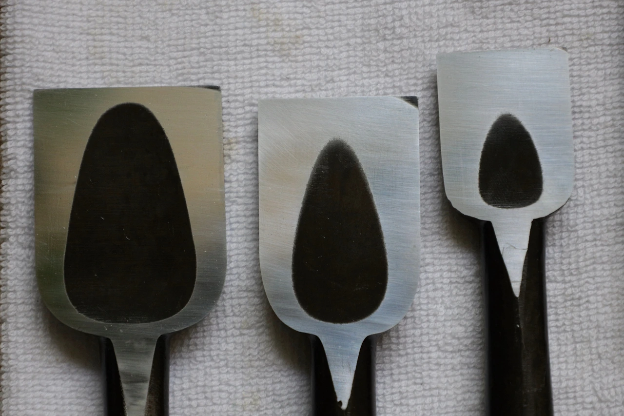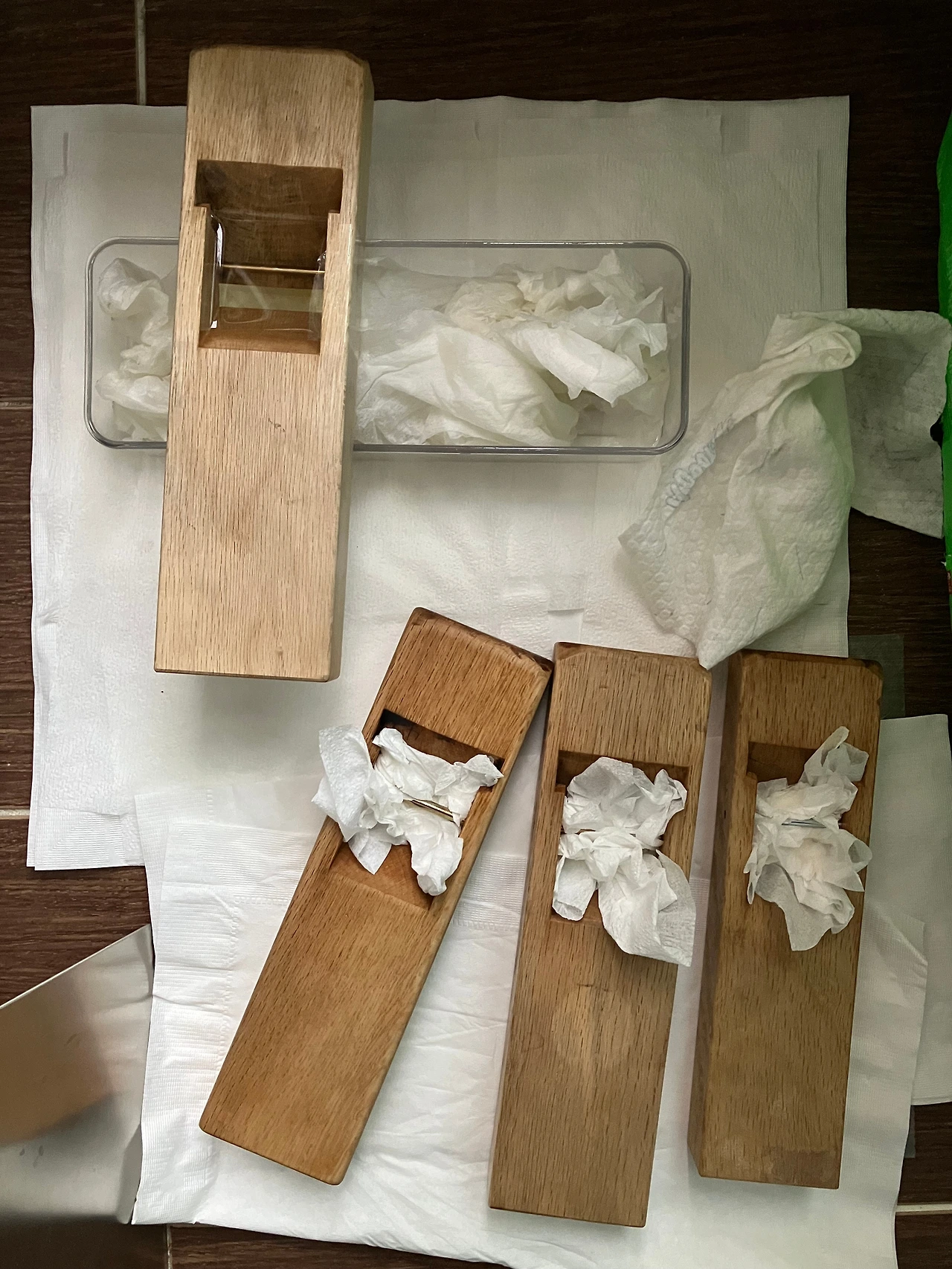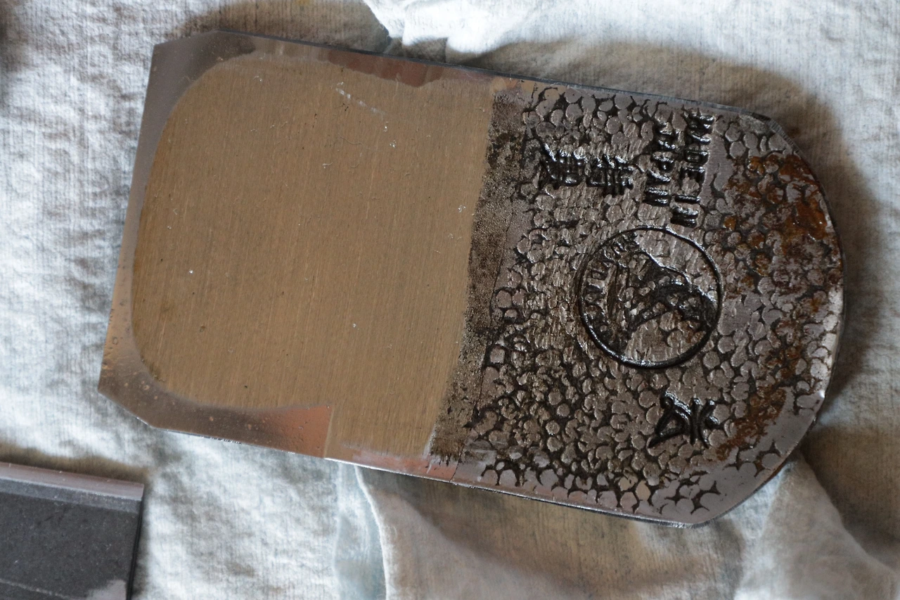 대패에 관심이 있었지만 제대로 시간을 내서 만져 본 적은 없었다. 공부를 시작하면서 새로 산 대패를 세팅해 보겠다고 유튜브를 보면서 따라 하다가 하나를 작살냈다. 그 실수를 바탕으로 다른 놈을 만져보고 있다. 목수 일을 직업으로 할 때 사두었던 대패와 이런저런 이유로 마련한 대패를 모두 꺼내서 연마를 했다. 주말마다 마음먹고 싱크대 앞에서 손가락이 휘도록 대팻날을 갈았다. 반짝이는 어미날의 표면을 쓰다듬으면서 이 정도면 됐다 싶었는데 나중에 알고 보니 모두 편갈이가 있었다. 편갈이는 연마를 하면서 힘이 한쪽으로 쏠려 날의 평행 상태가 깨지고 기우뚱한 '찐따'가 됐다는 의미다. 이러면 대팻날을 미세하게 조절할 수 없다고 알고 있다.