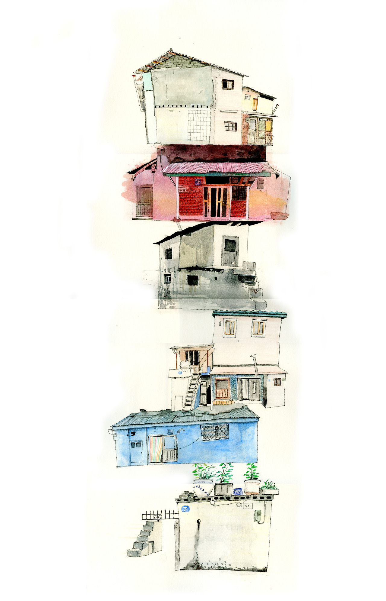 그림은 집에 돌아와서 그렸다. 낮에 본 인천의 집들을 아파트처럼 높이 쌓았다. 어쩐지 가로보다는 세로로 높이 쌓아야 할 것 같았다. 욕망을 생각했던 것 같은데 욕심이 적은 사람들이 수평을 선호한다면 욕망은 세로로 쌓이니까.