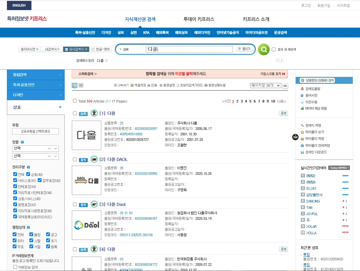 위 사진처럼 저는 순 우리말로 '복이 다 온다'는 좋은 의미의 '다올'이라는 상호명을 검색해보았는데요. 스크롤을 내려보면 10페이지가 넘게 있는 것을 확인할 수 있었습니다. 업종을 나타내는 상품분류가 다를 경우에 상표는 중복으로 등록이 가능하기 때문에 여러 회사에서 사용하고 있는 이름으로 확인됩니다.